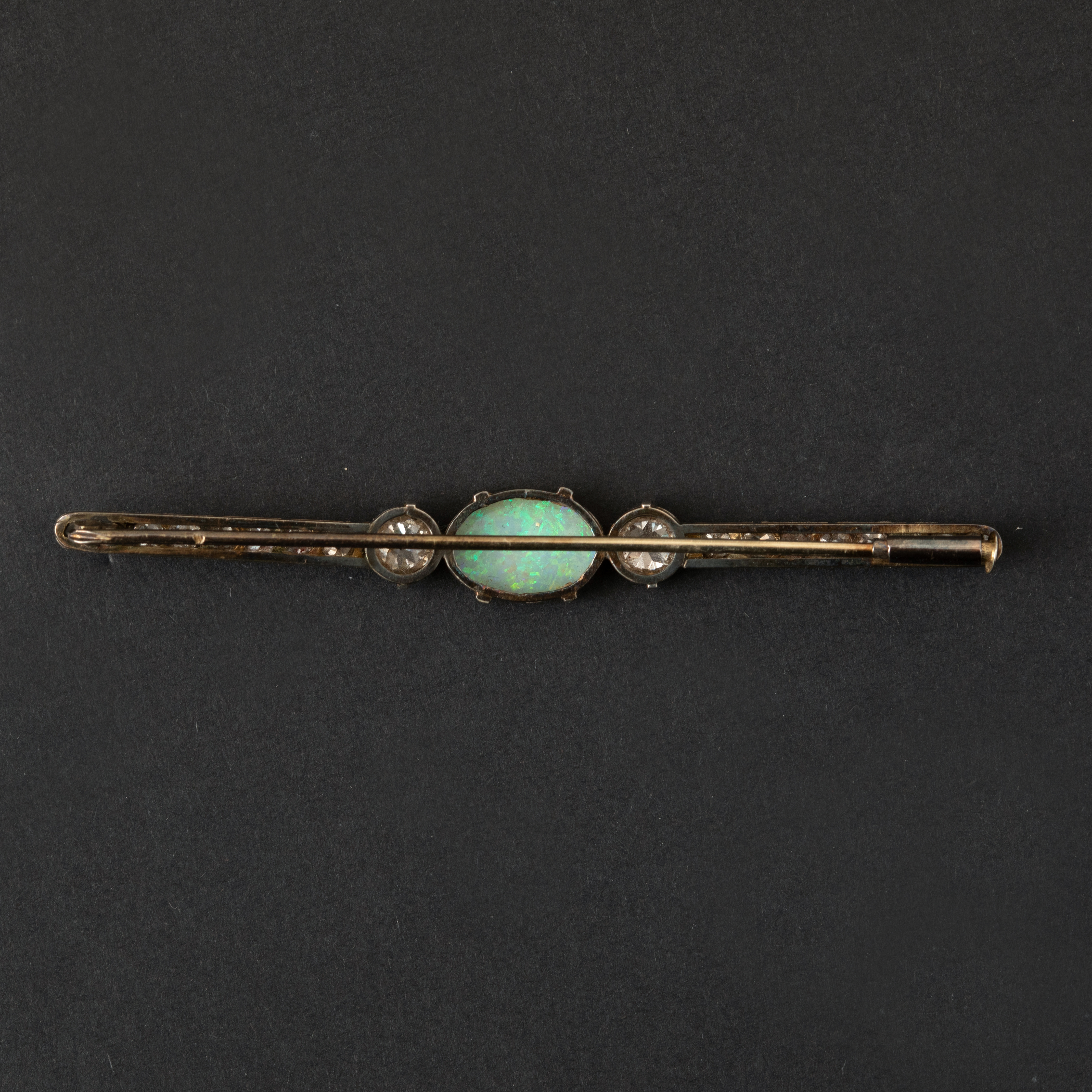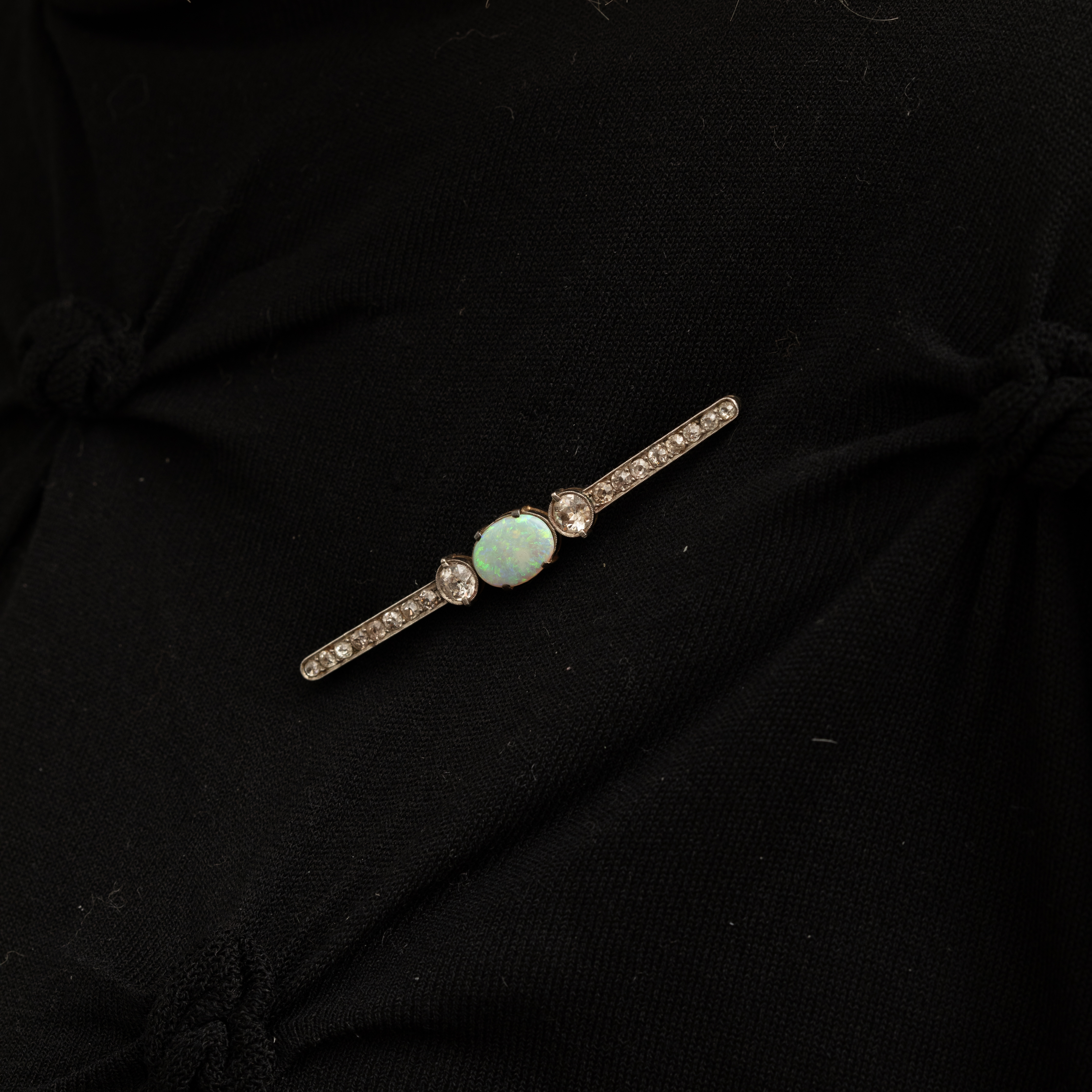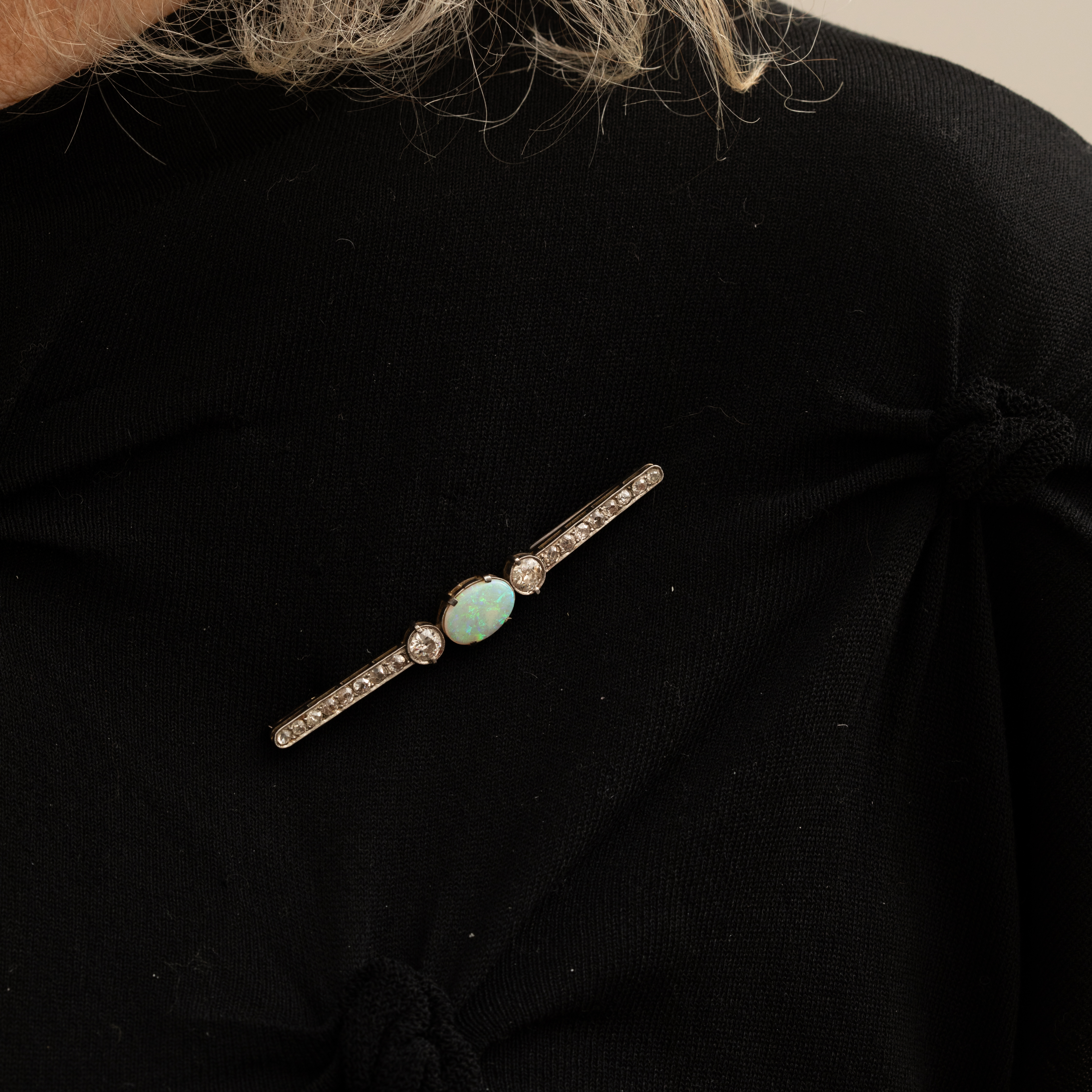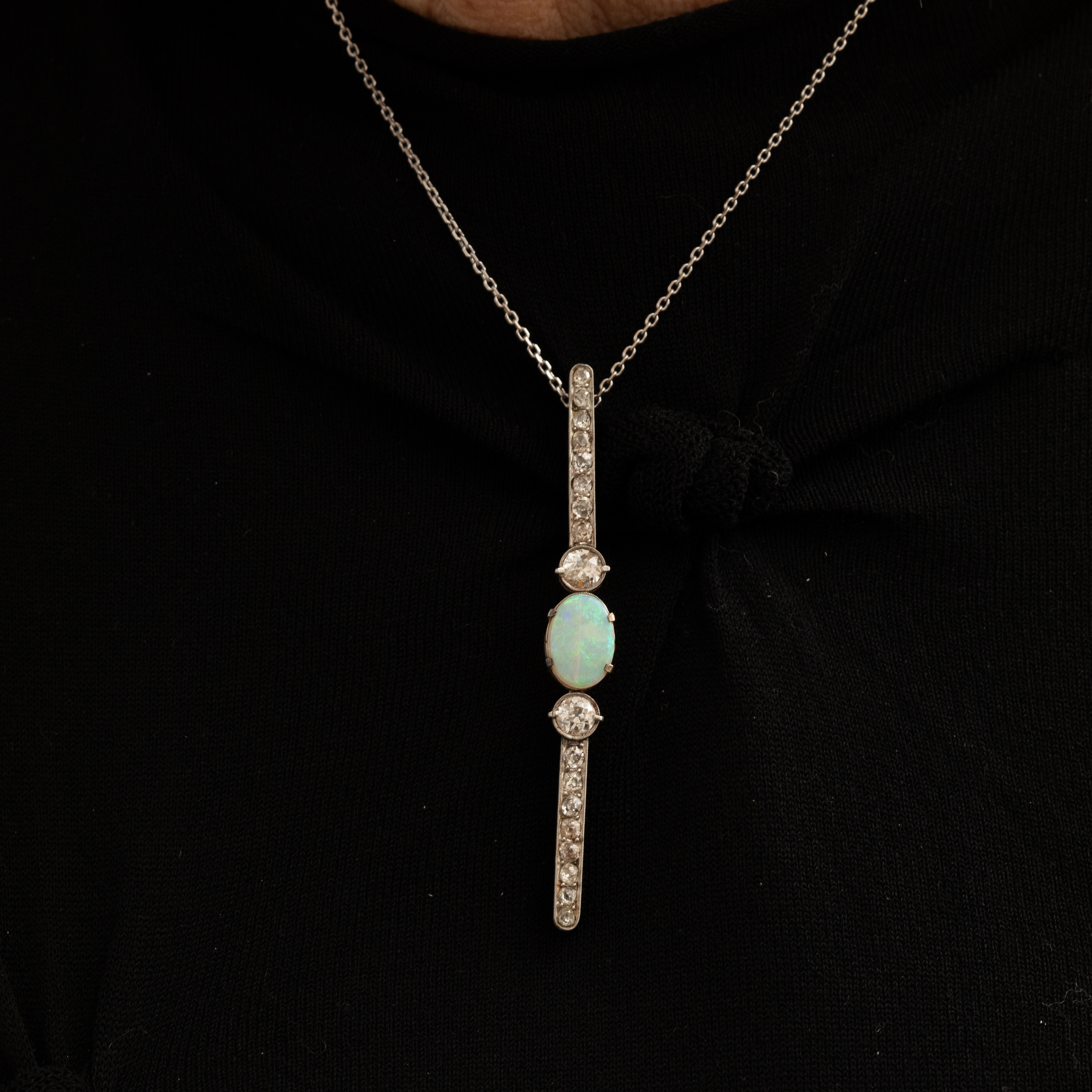 Imaginez le feu hypnotique d'une opale naturelle ovale cabochon au cœur de votre tenue, entourée de diamants taille ancienne qui dansent sous la lumière.