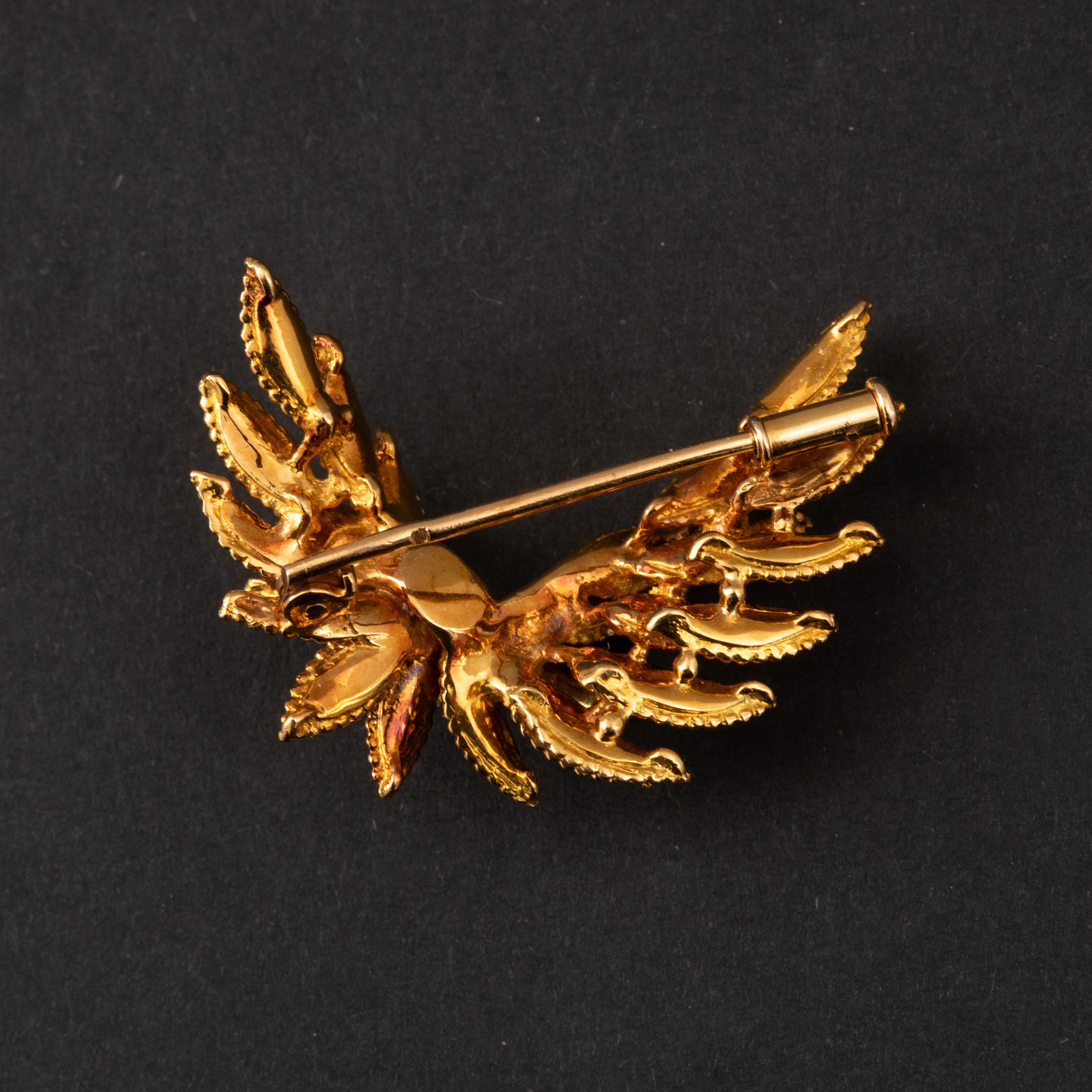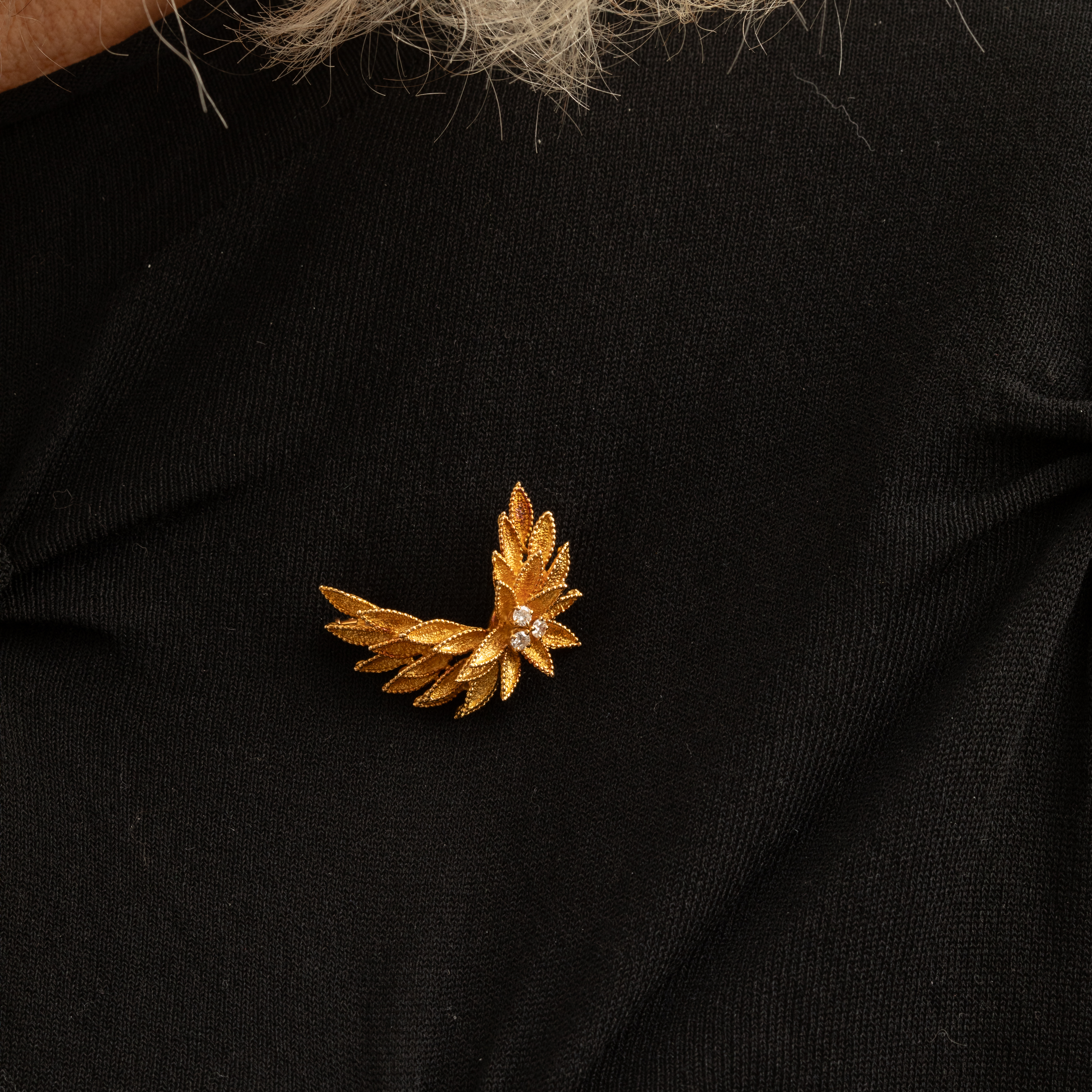 Plongez dans l'univers raffiné des bijoux vintage avec cette broche en or jaune 18k, où des feuillages stylisés dansent autour de trois diamants naturels taille brillant.