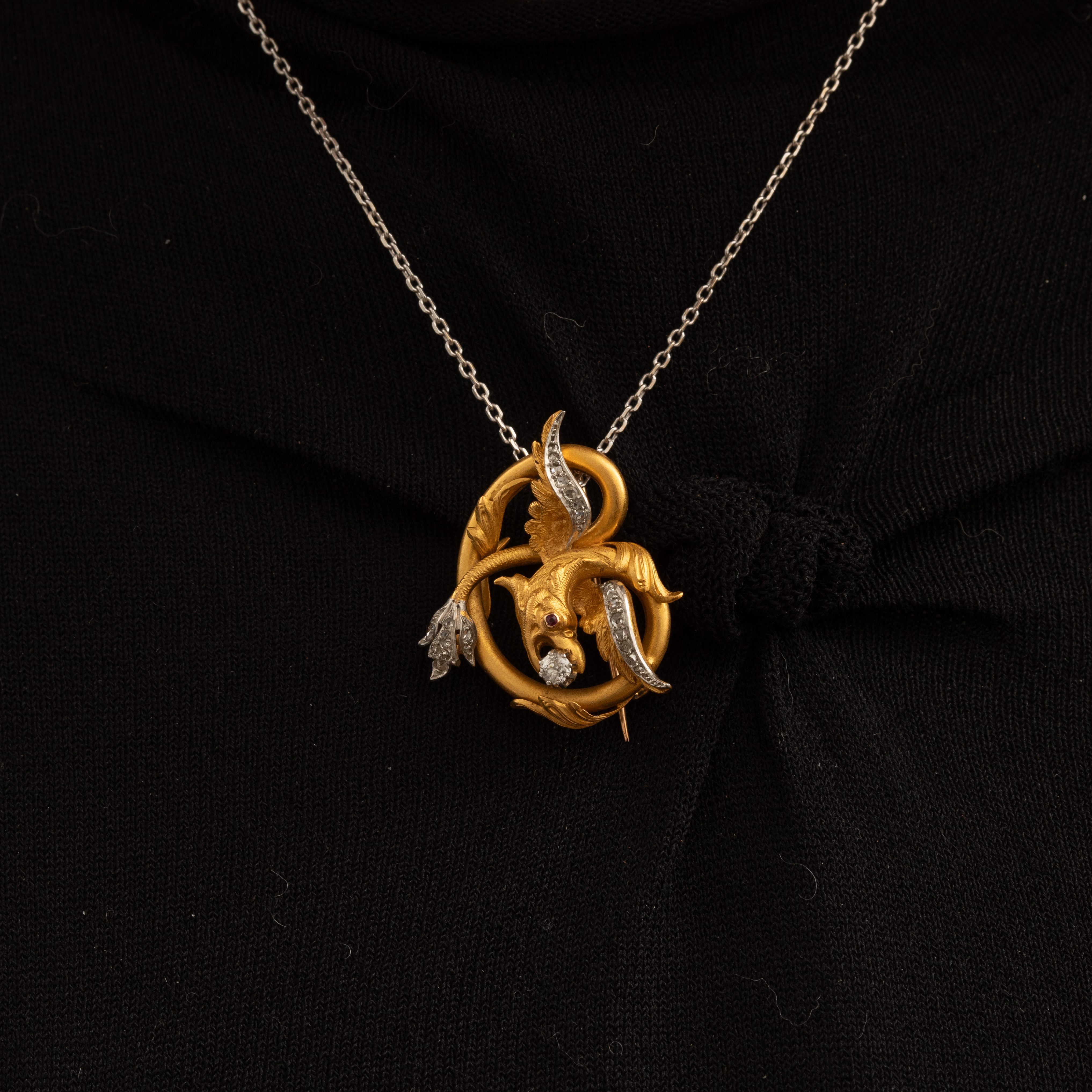 Broche Art Nouveau Dragon Diamants 1500.0 EUR Broche Art Nouveau dragon diamants : élégance mystique et raffinement éternel   Plongez dans l'univers envoûtant de l'Art Nouveau avec cette broche pendentif exceptionnelle, où un dragon majestueux...
