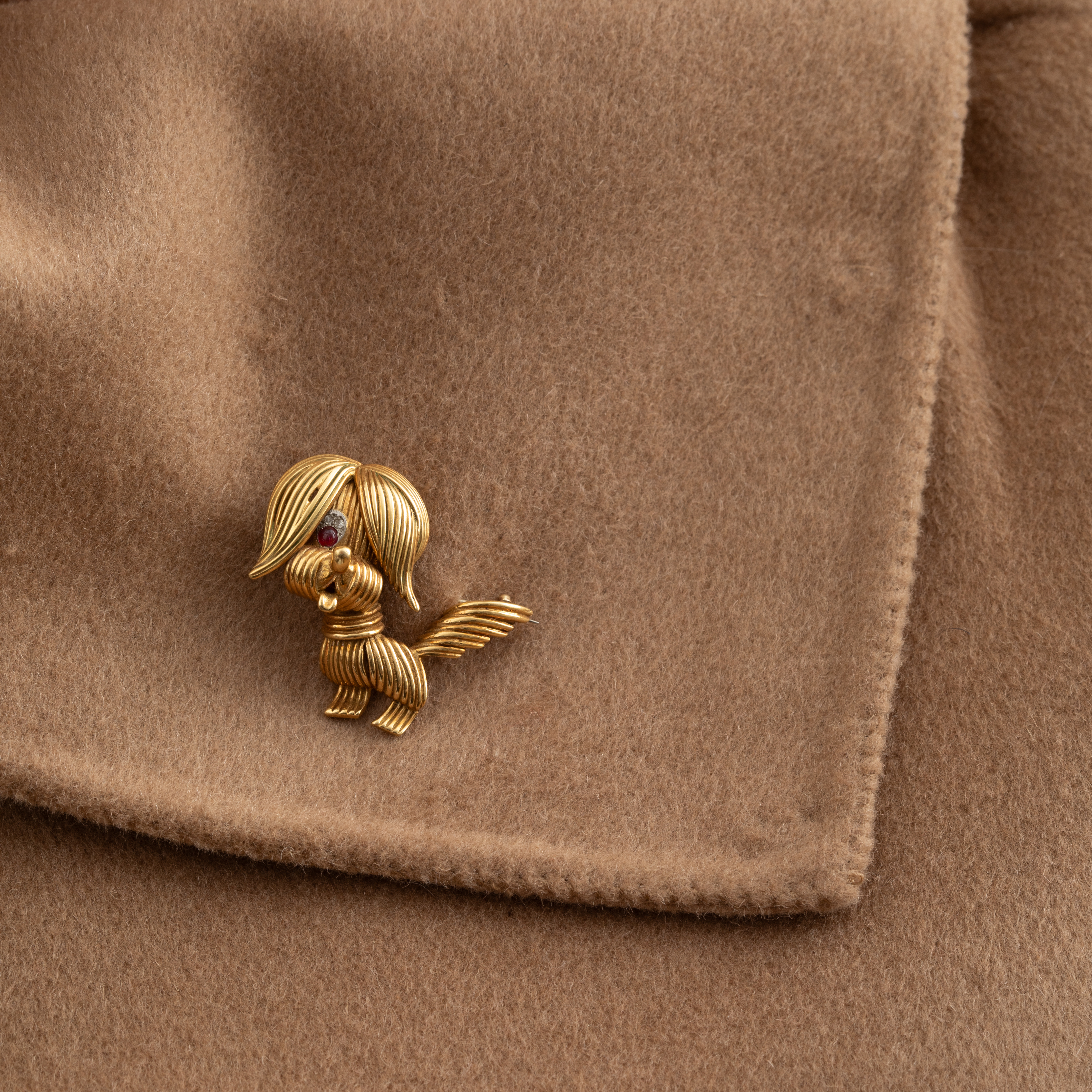 Broche Vintage Chien Ébouriffé en Or 18k avec Rubis et Diamants