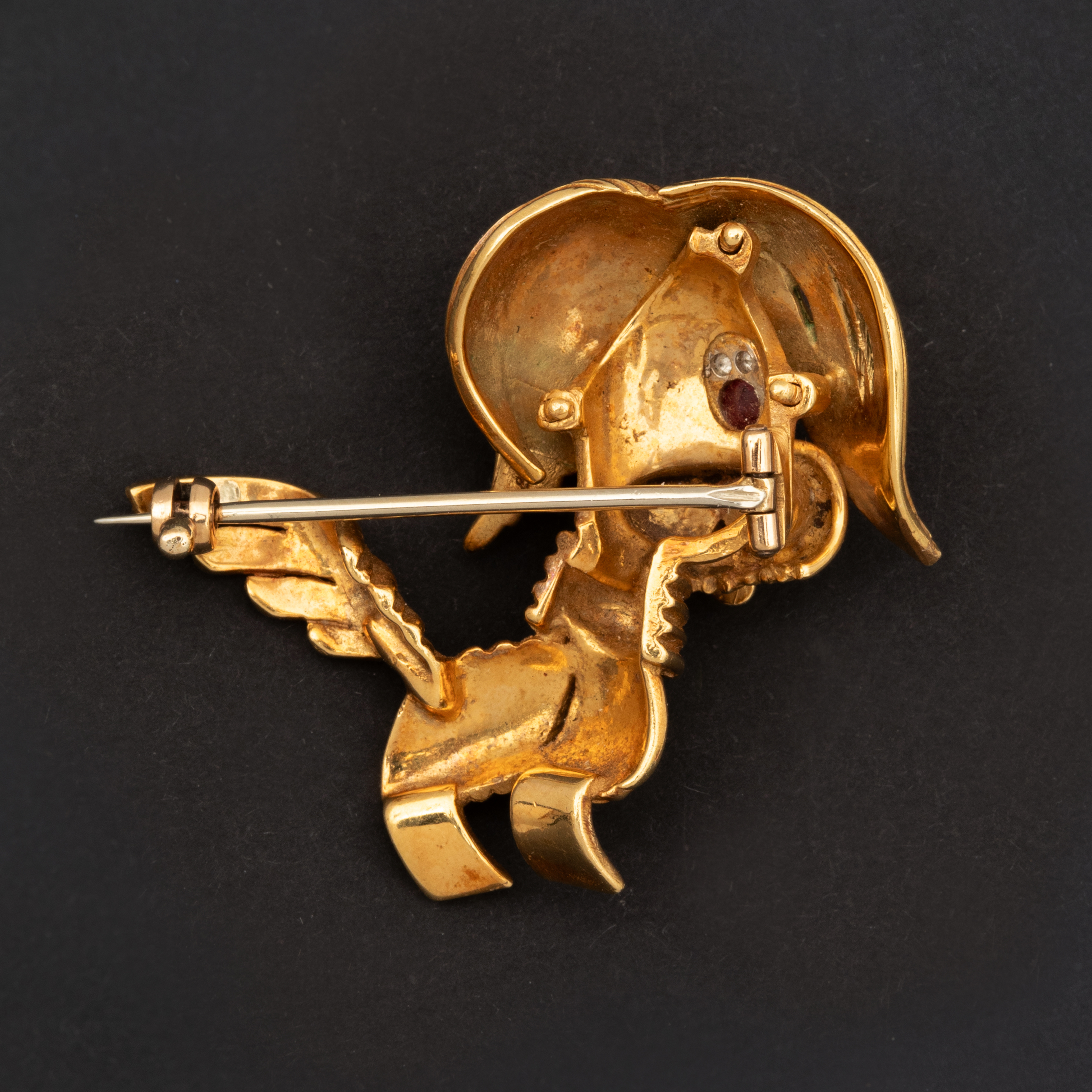 Cette broche vintage en or jaune 18k est bien plus qu'un bijou : elle évoque le charme des années 40-50, apportant une touche de sophistication ludique à vos tenues quotidiennes ou soirées spéciales.
