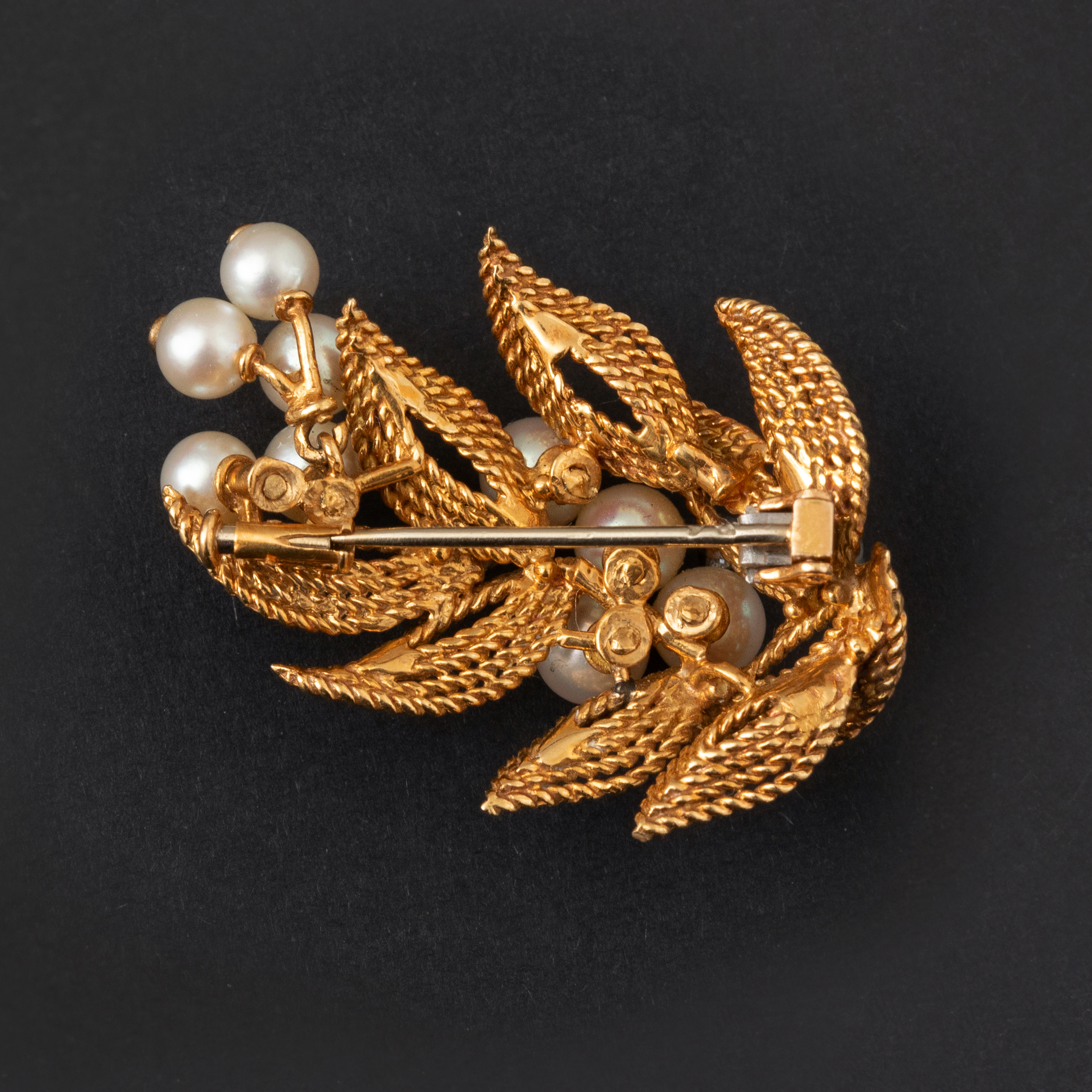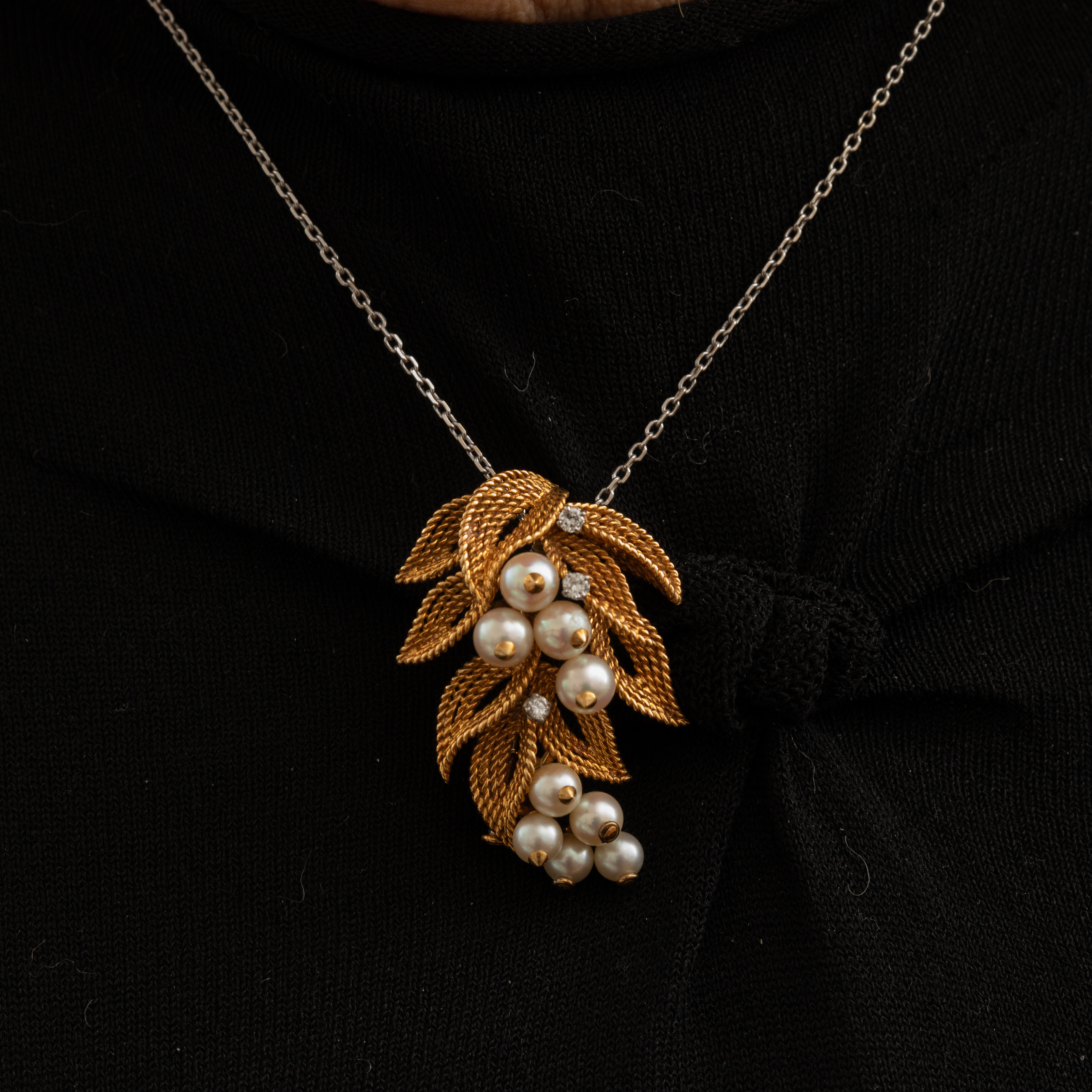 Imaginez une touche de nature raffinée qui sublime votre style quotidien. Cette broche feuillage en or jaune et gris 18k guilloché capture l'essence poétique des feuilles dansantes, ornée de perles de culture lumineuses et de diamants étincelants.