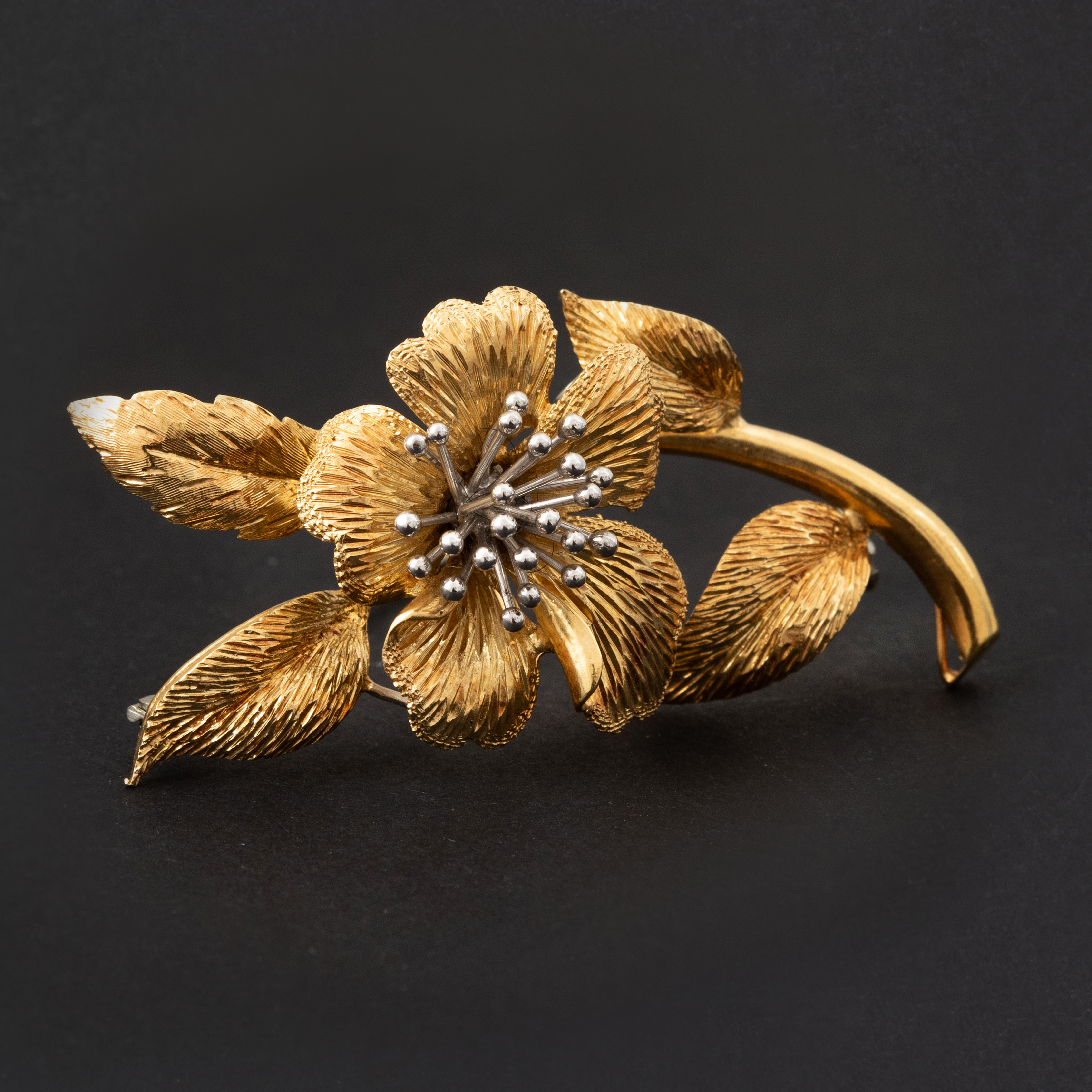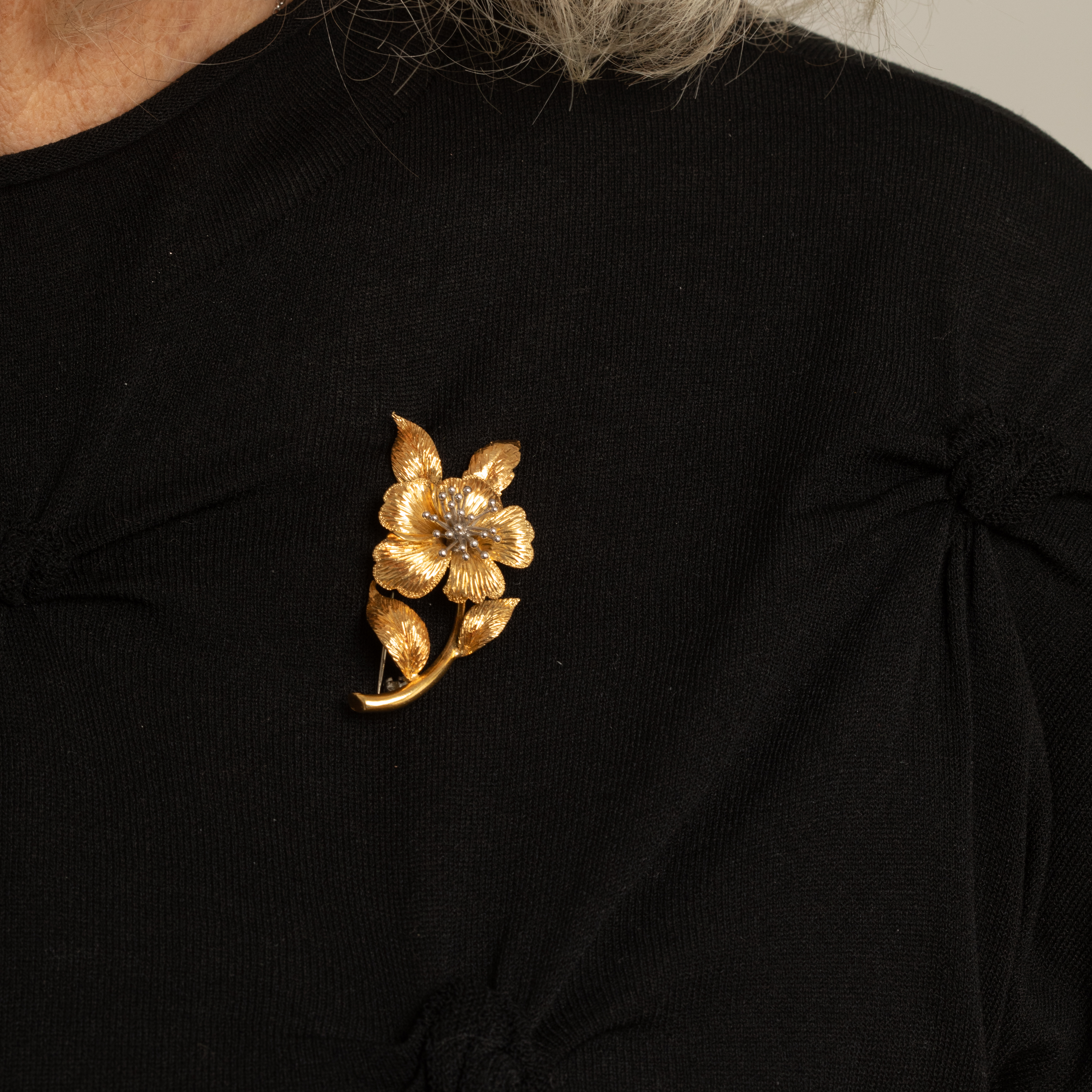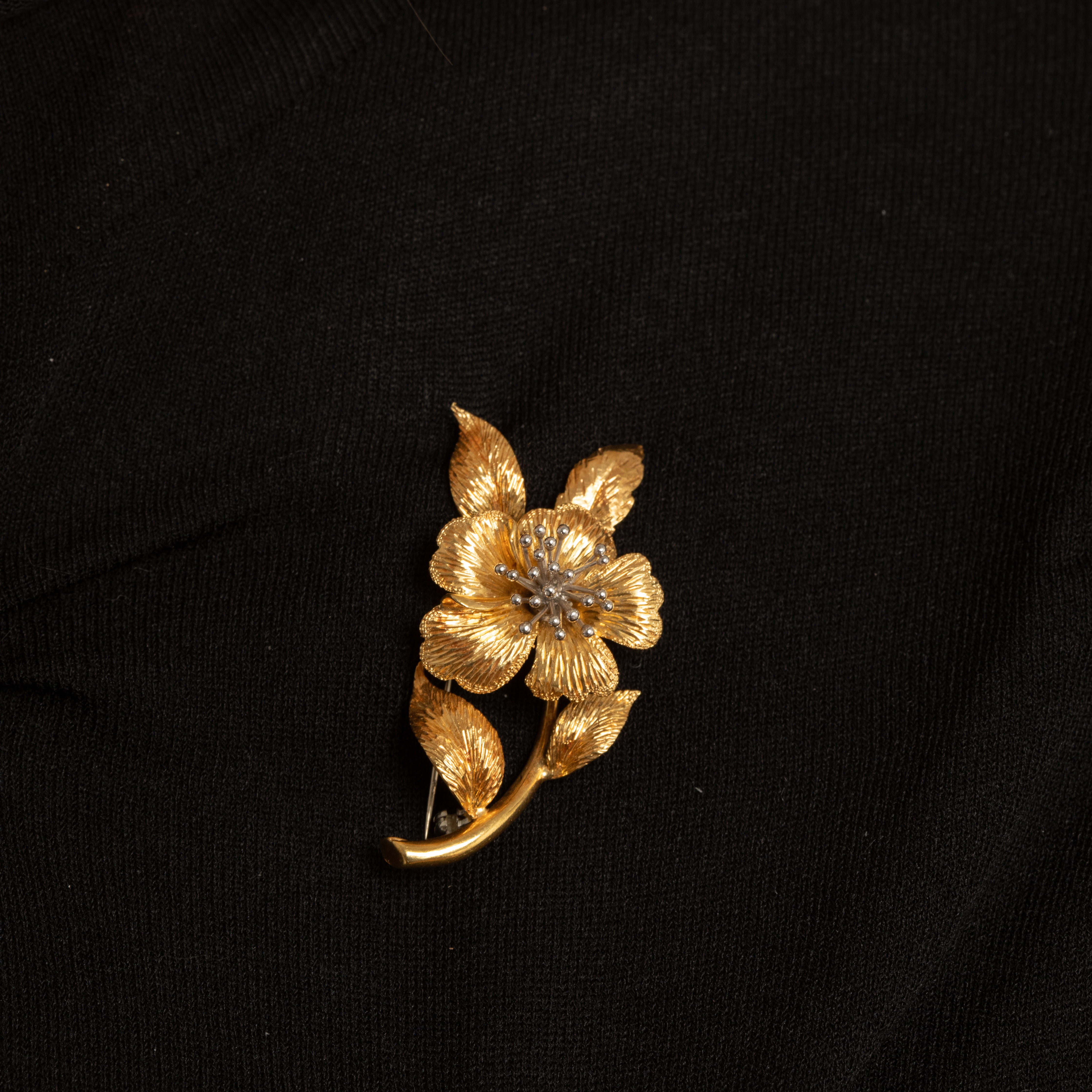 • Or jaune 18k pour la fleur épanouie et ses feuilles délicates