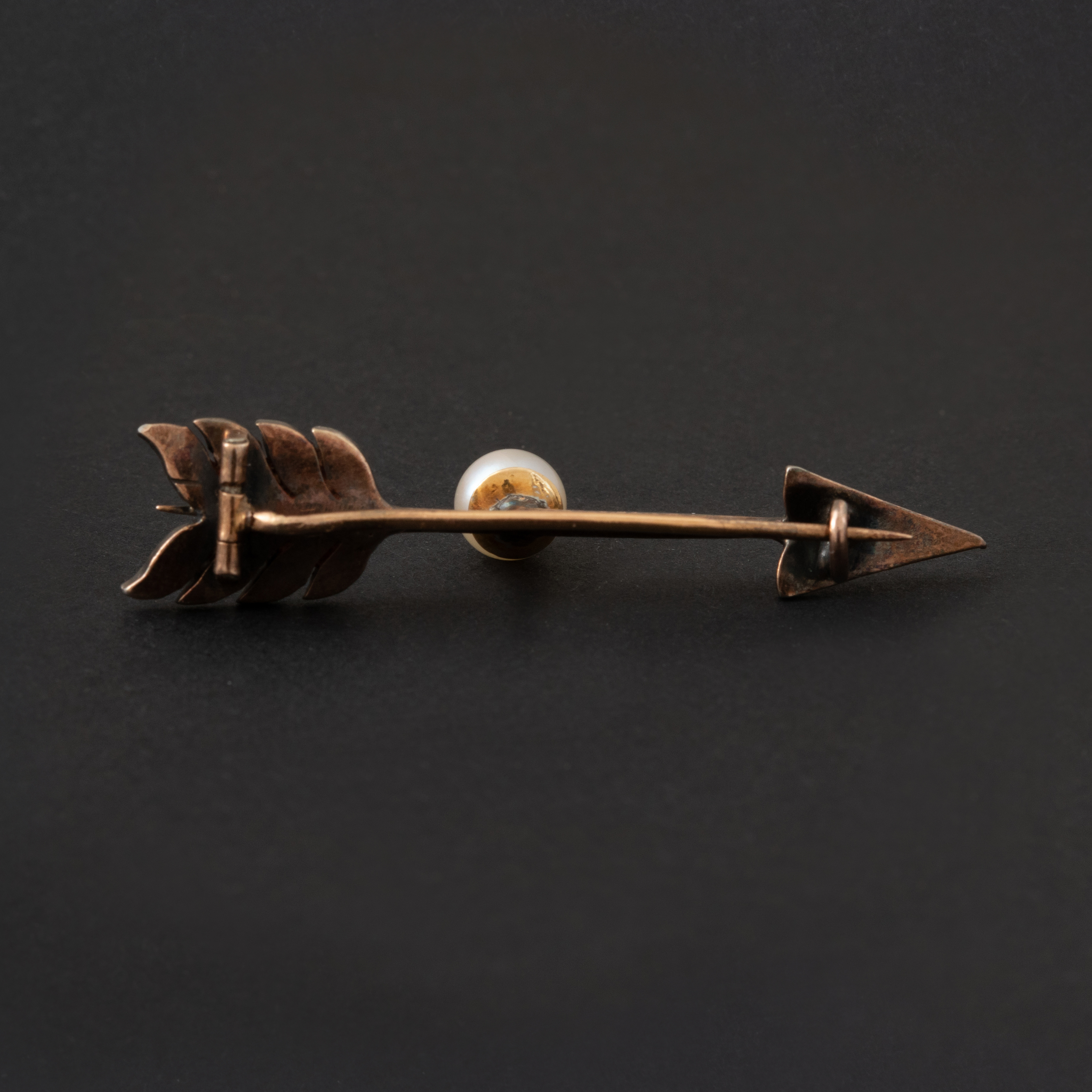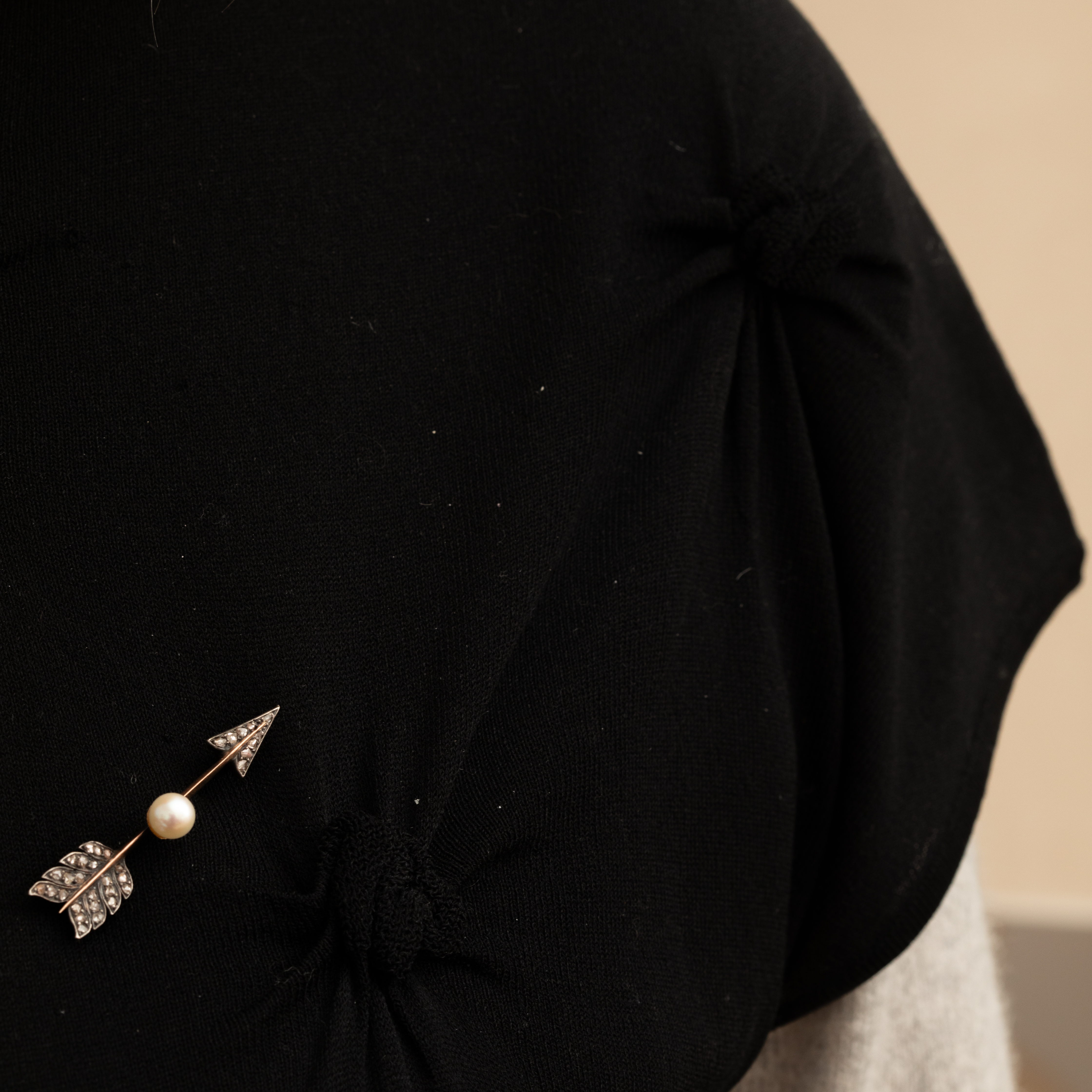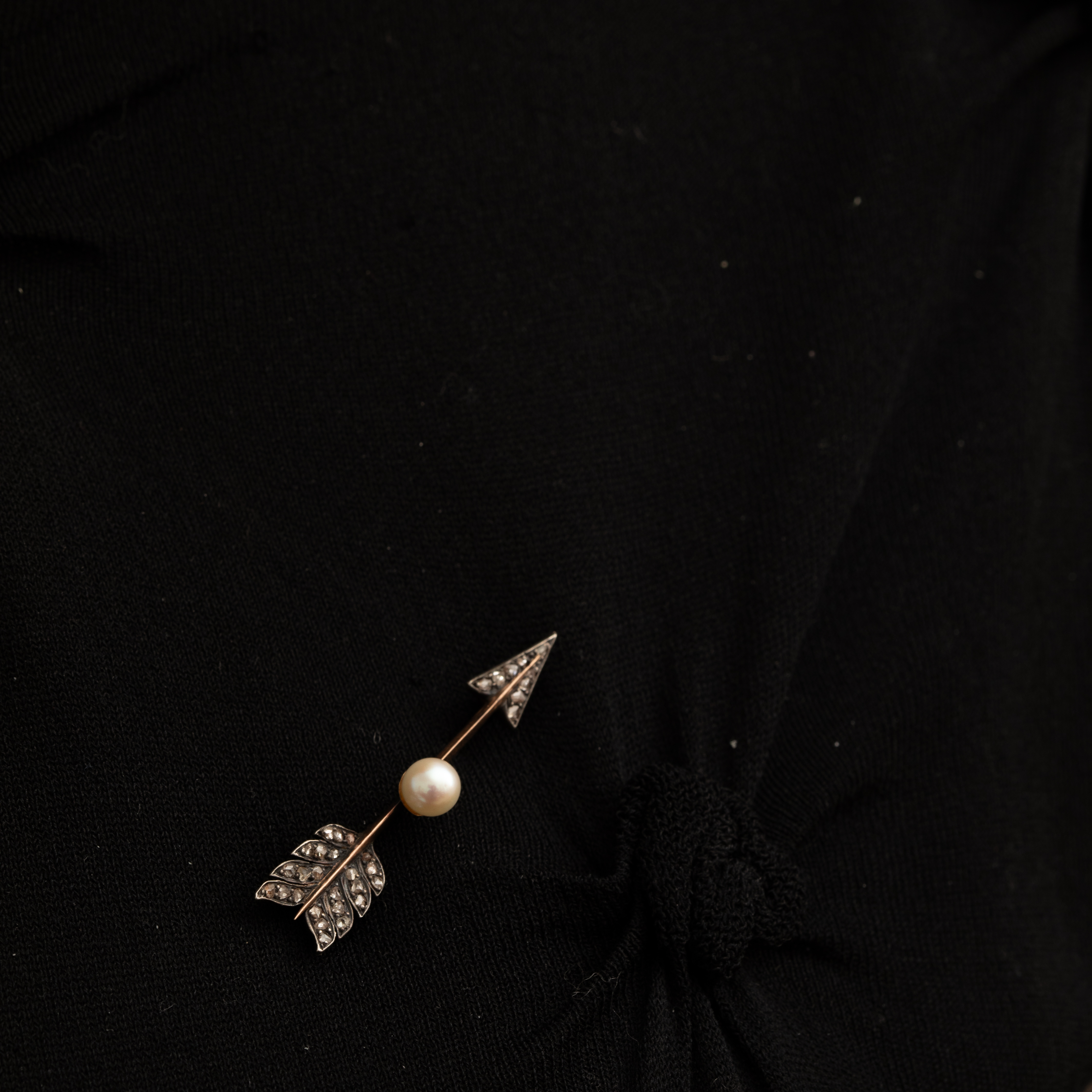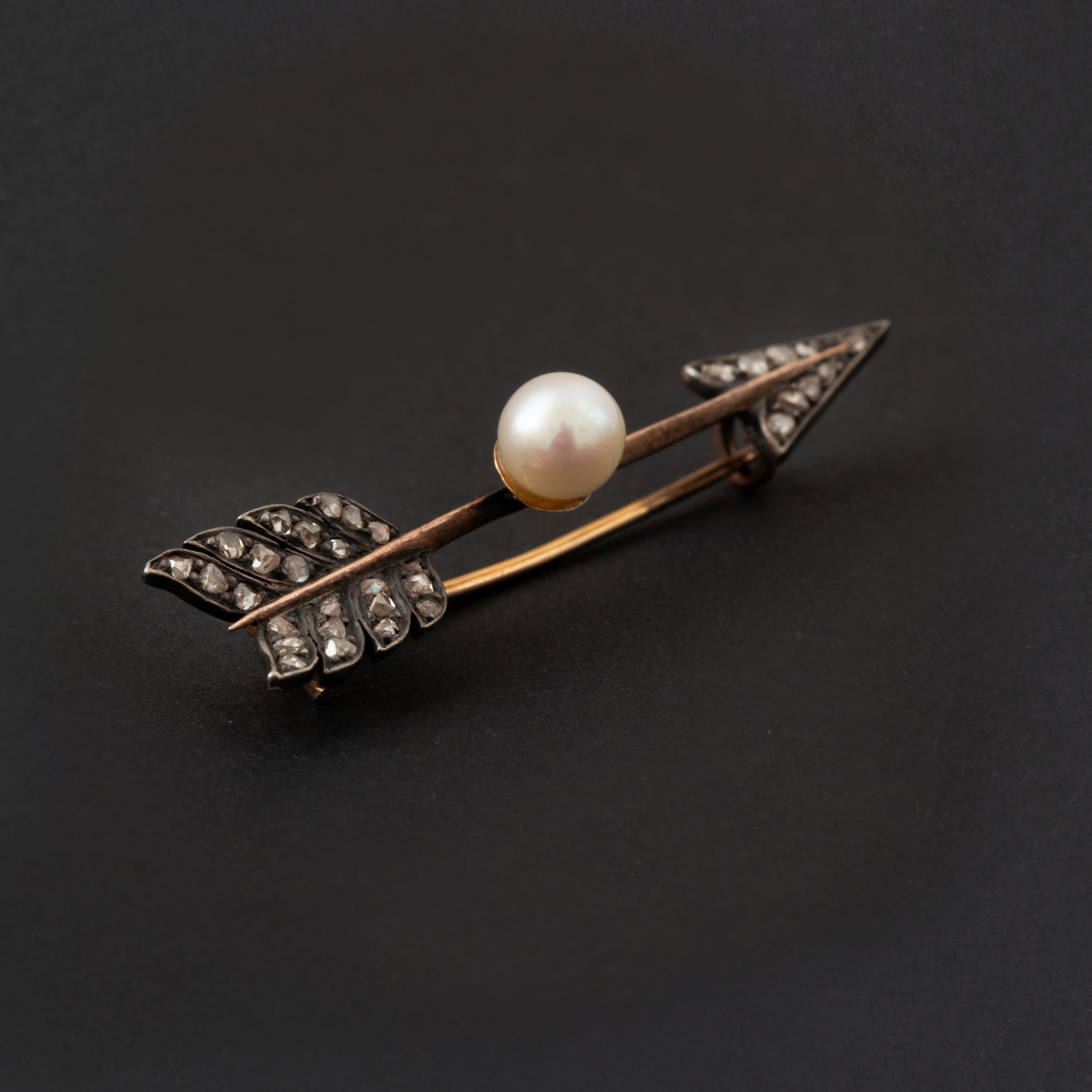 Broche flèche ancienne avec perle et diamants : élégance intemporelle Imaginez le scintillement subtil des diamants naturels taille rose capturant la lumière, au cœur d'une perle de culture Akoya...