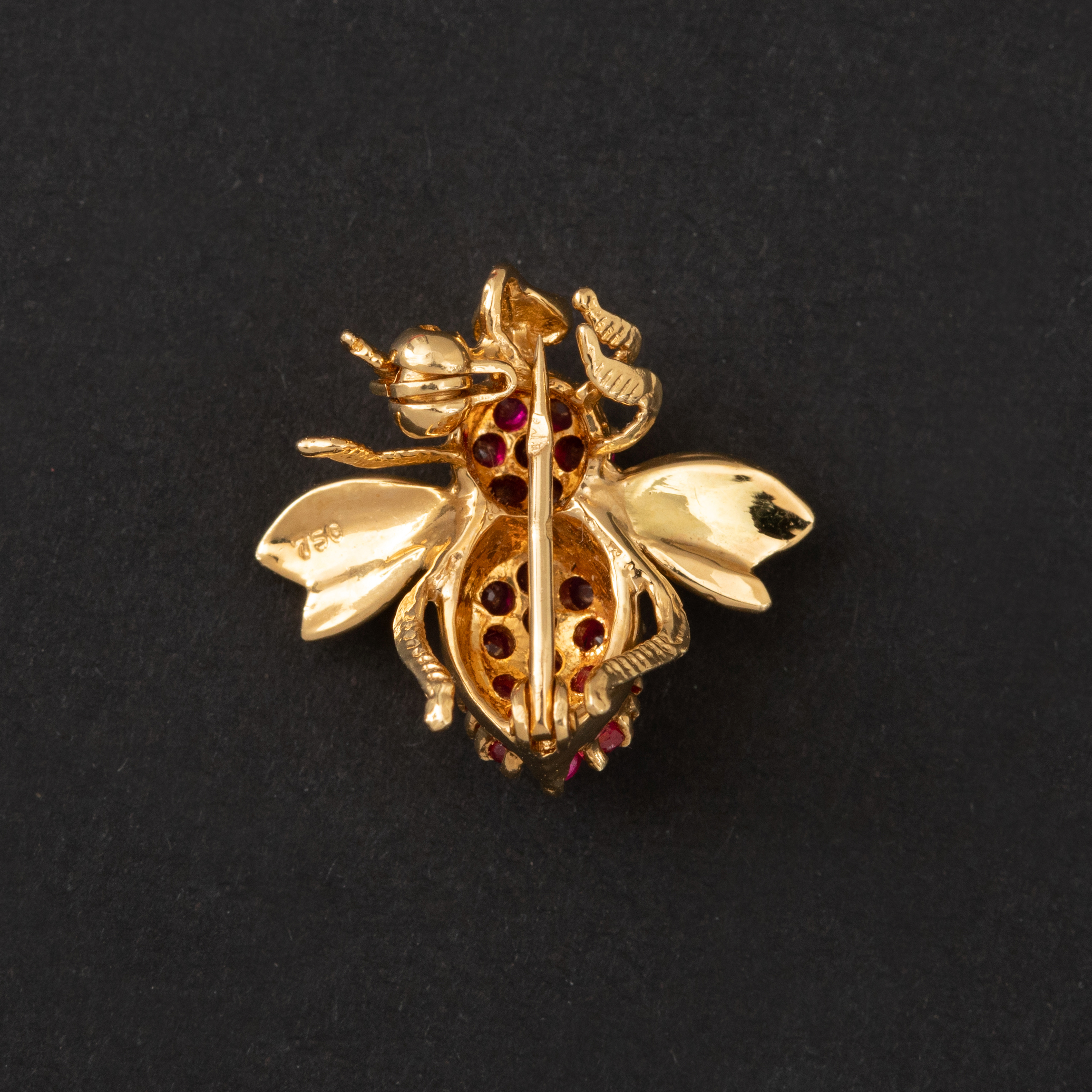 Description : Broche en or trois tons (18k) amati figurant un papillon. Ailes ciselées, corps et antennes ponctués de pierres rouges. Travail français de la fin du 19ème siècle. Dimensions : 35...