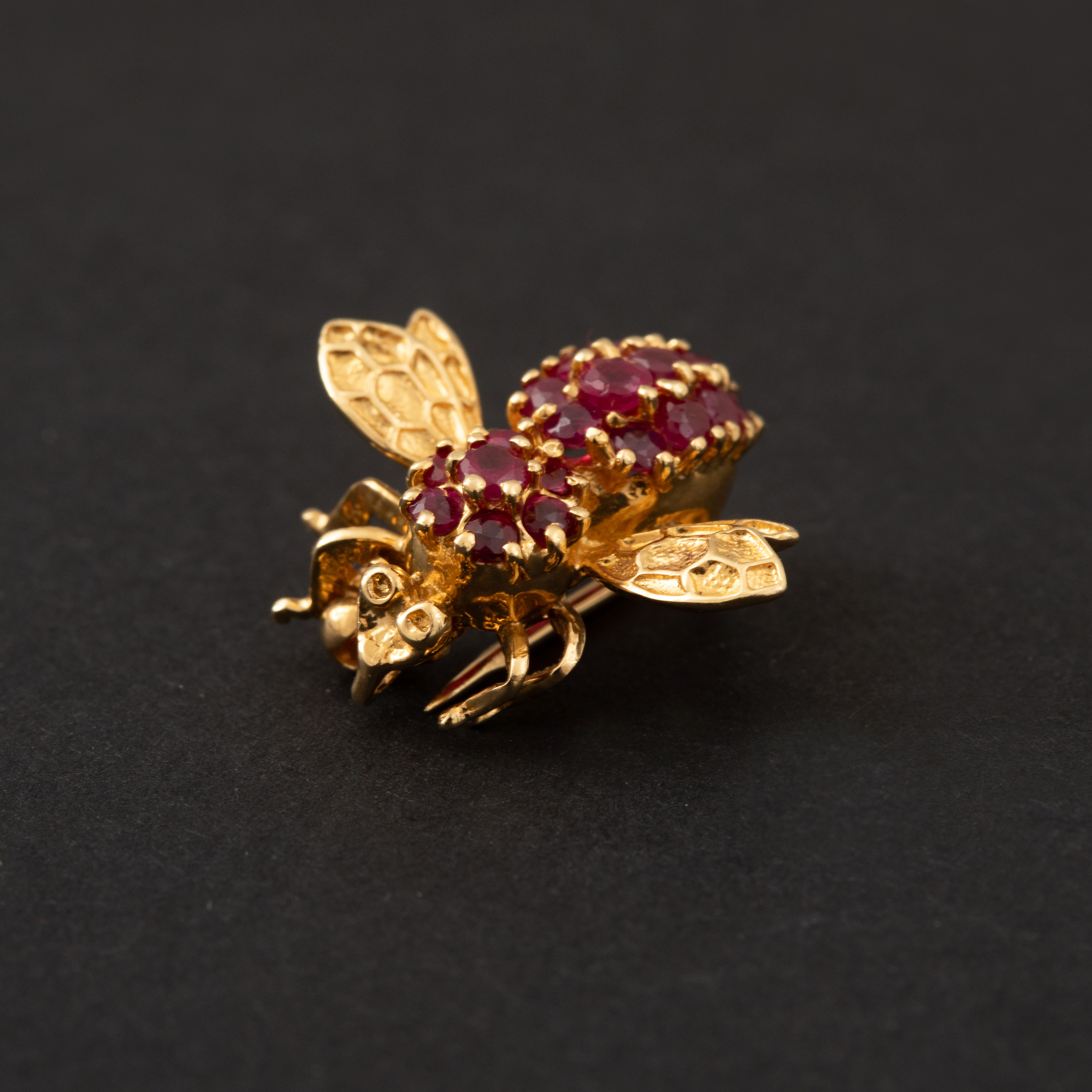 Description : Broche en or jaune (18k) finement ciselé figurant un oiseau posé sur une branche. L'œil ponctué d'un petit rubis en serti clos. Travail français vers 1960. Poids Brut : 8,10 g....