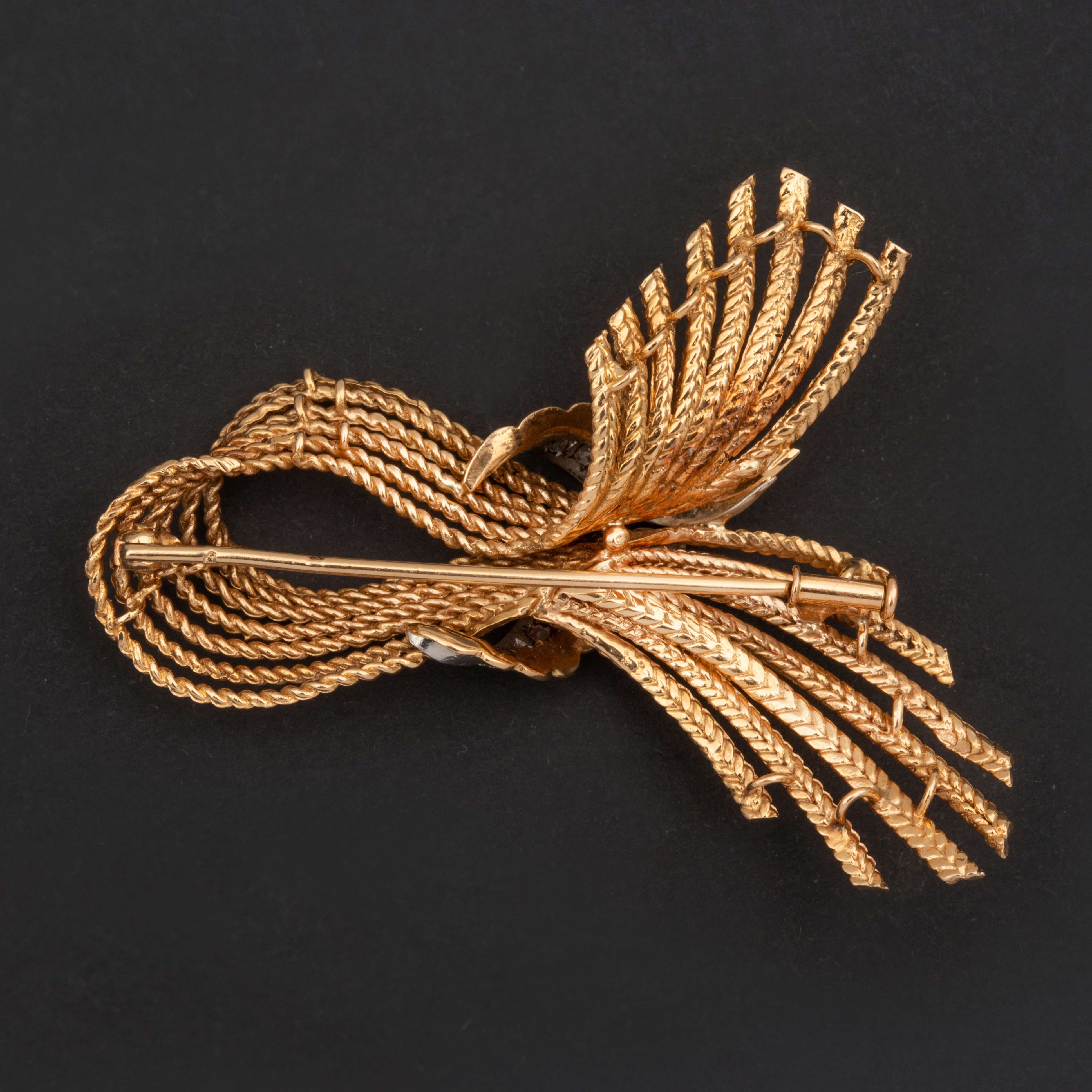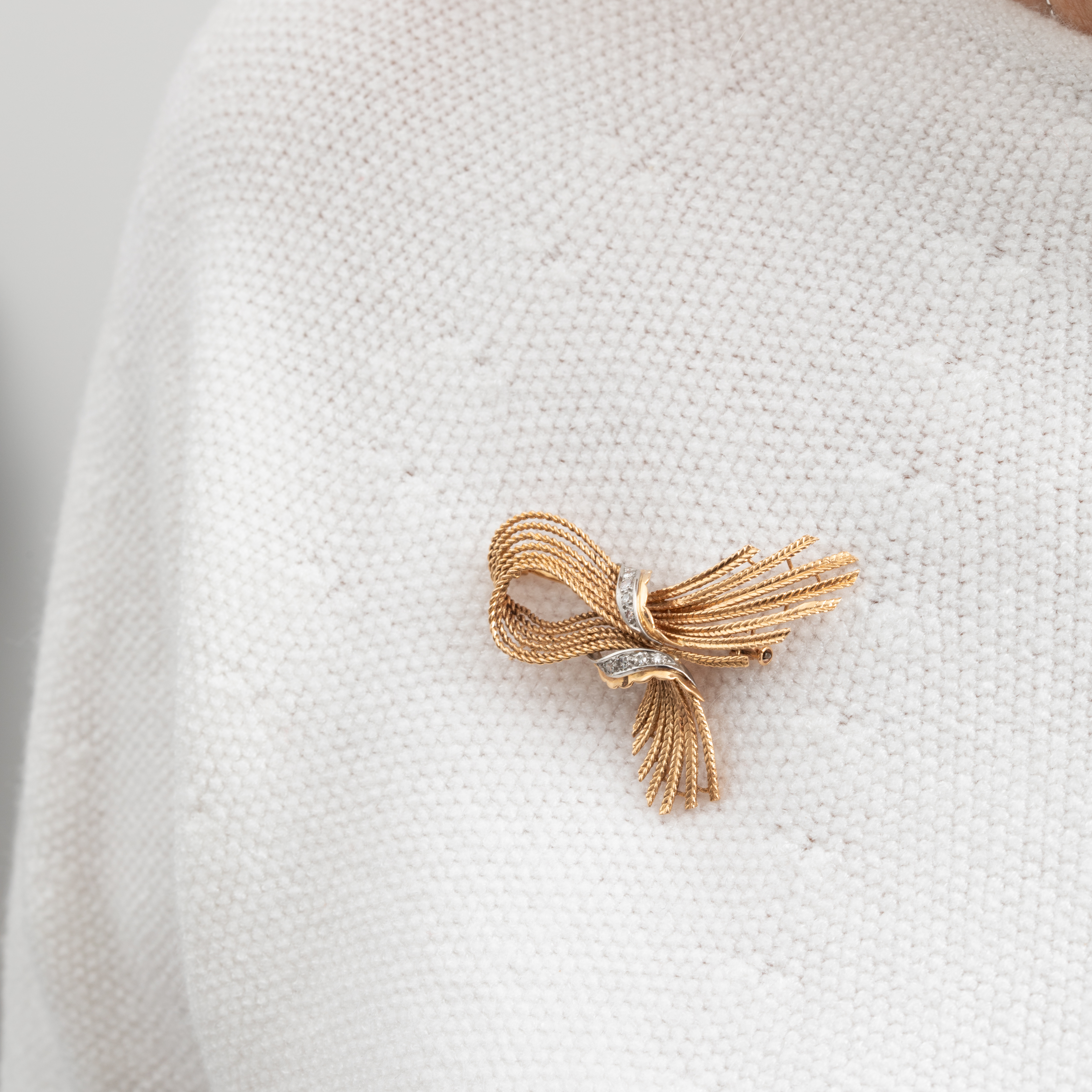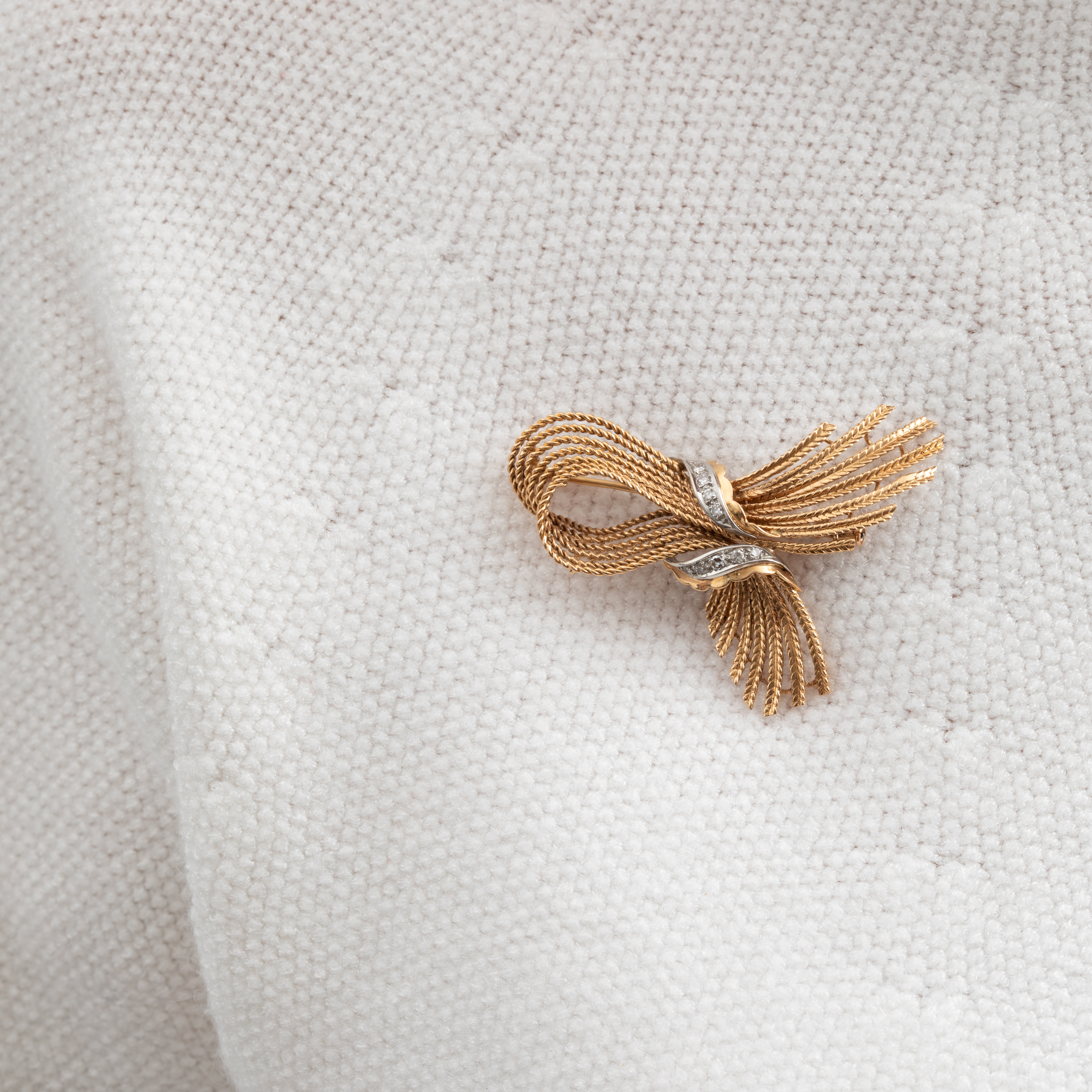 Plongez dans l'univers raffiné des années 40 avec cette broche vintage nœud avec diamants, un bijou qui capture l'essence de l'élégance d'antan.