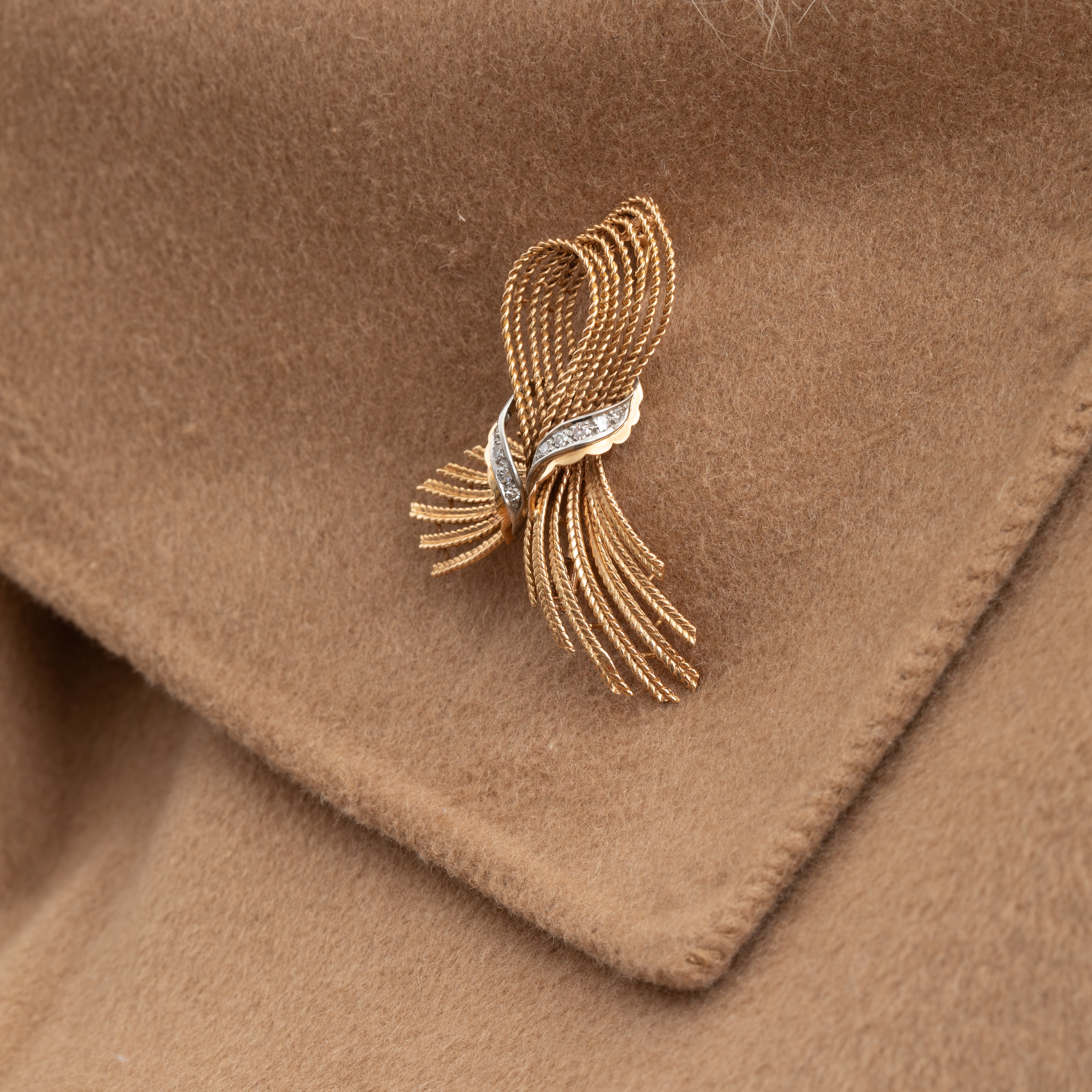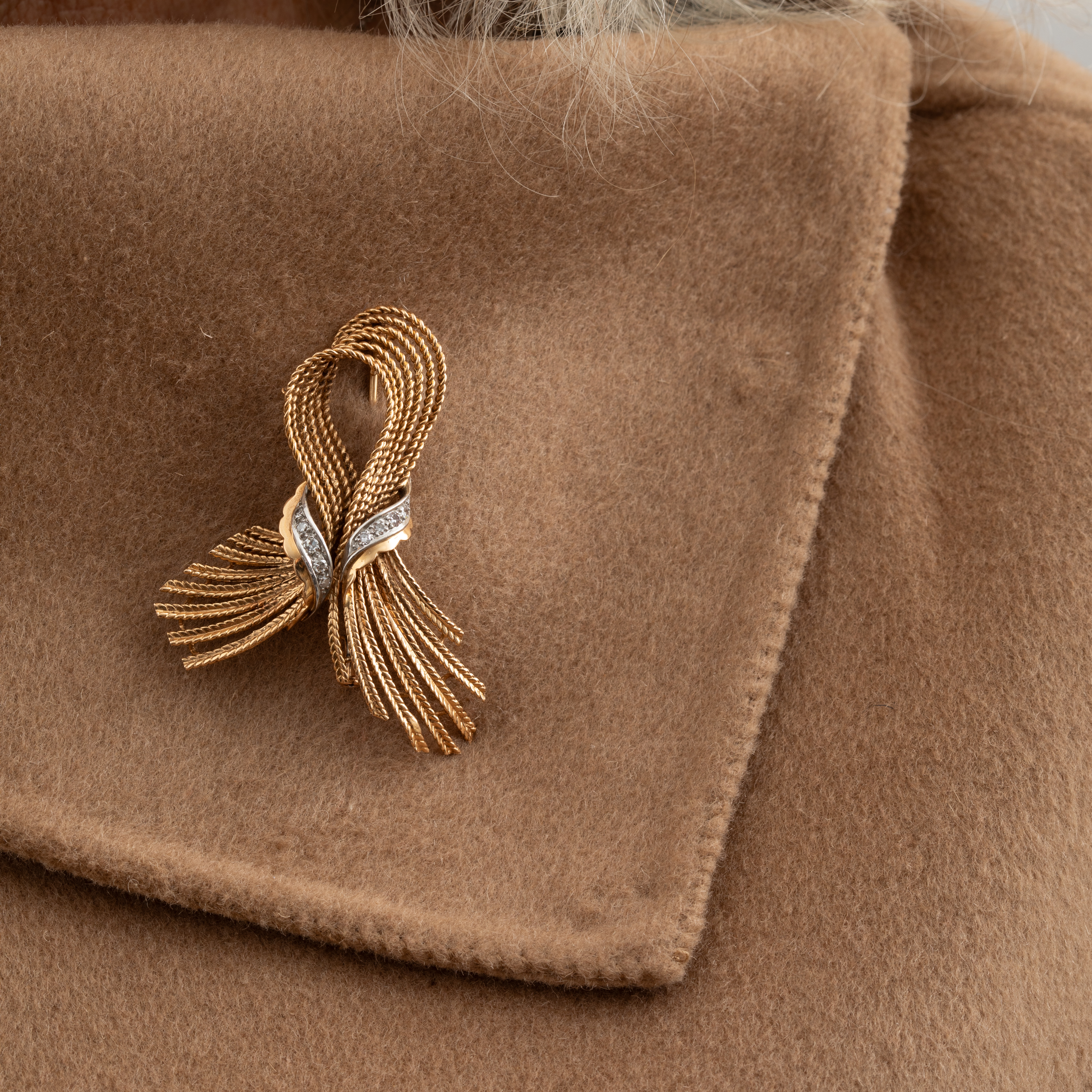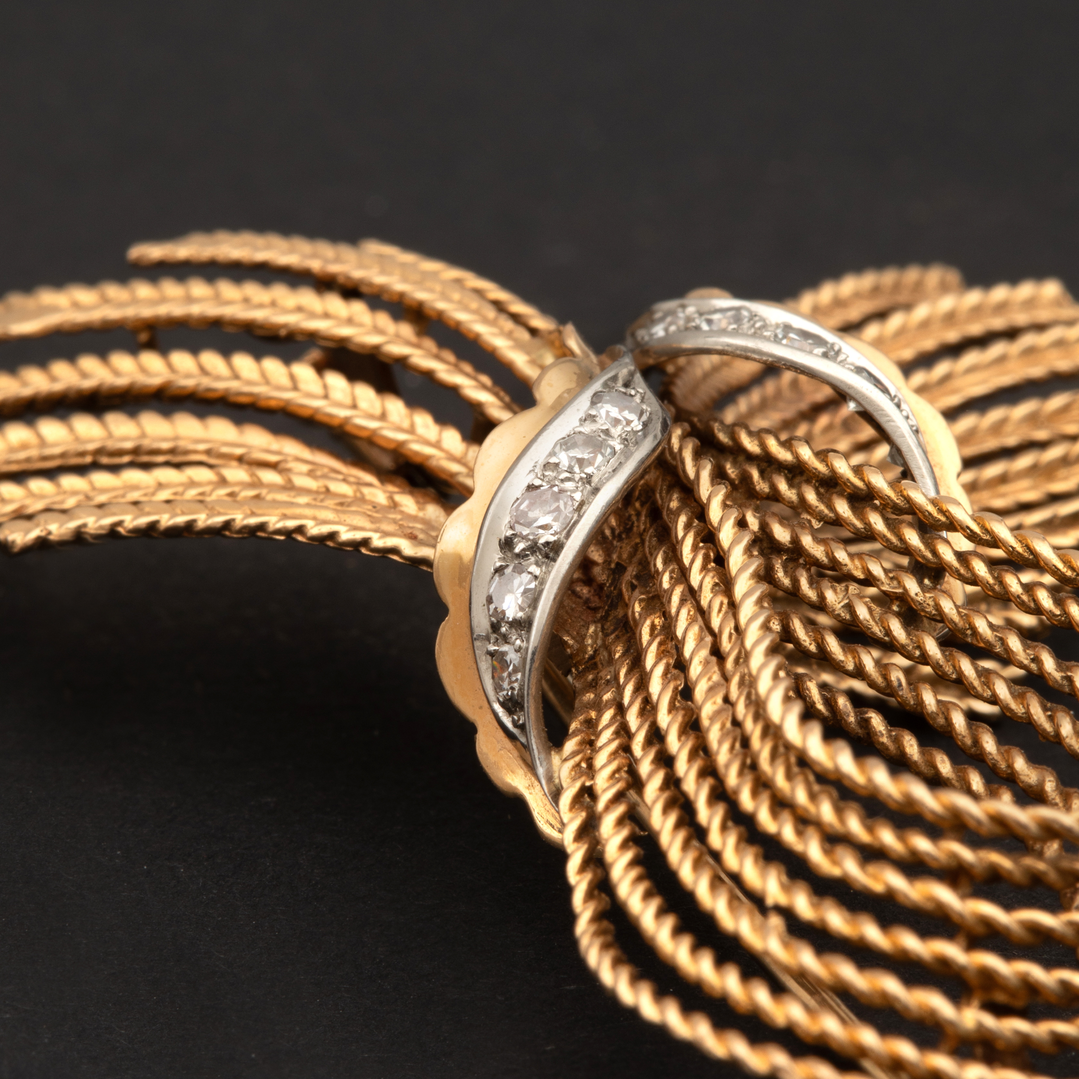 Plongez dans l'univers raffiné des années 40 avec cette broche vintage nœud avec diamants, un bijou qui capture l'essence de l'élégance d'antan.