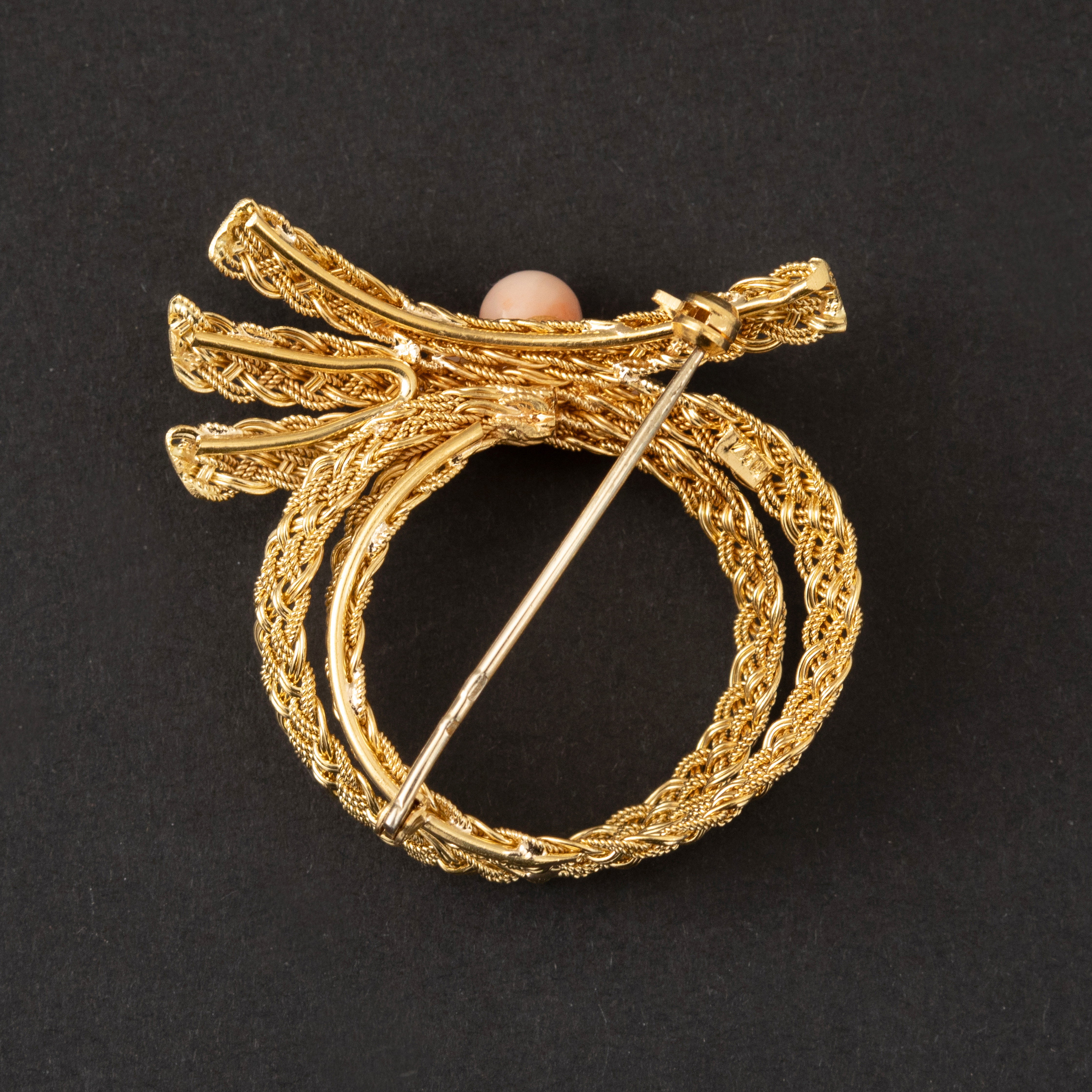 Découvrez dès maintenant cette broche or 18k avec corail et laissez-la illuminer votre collection de bijoux vintage.