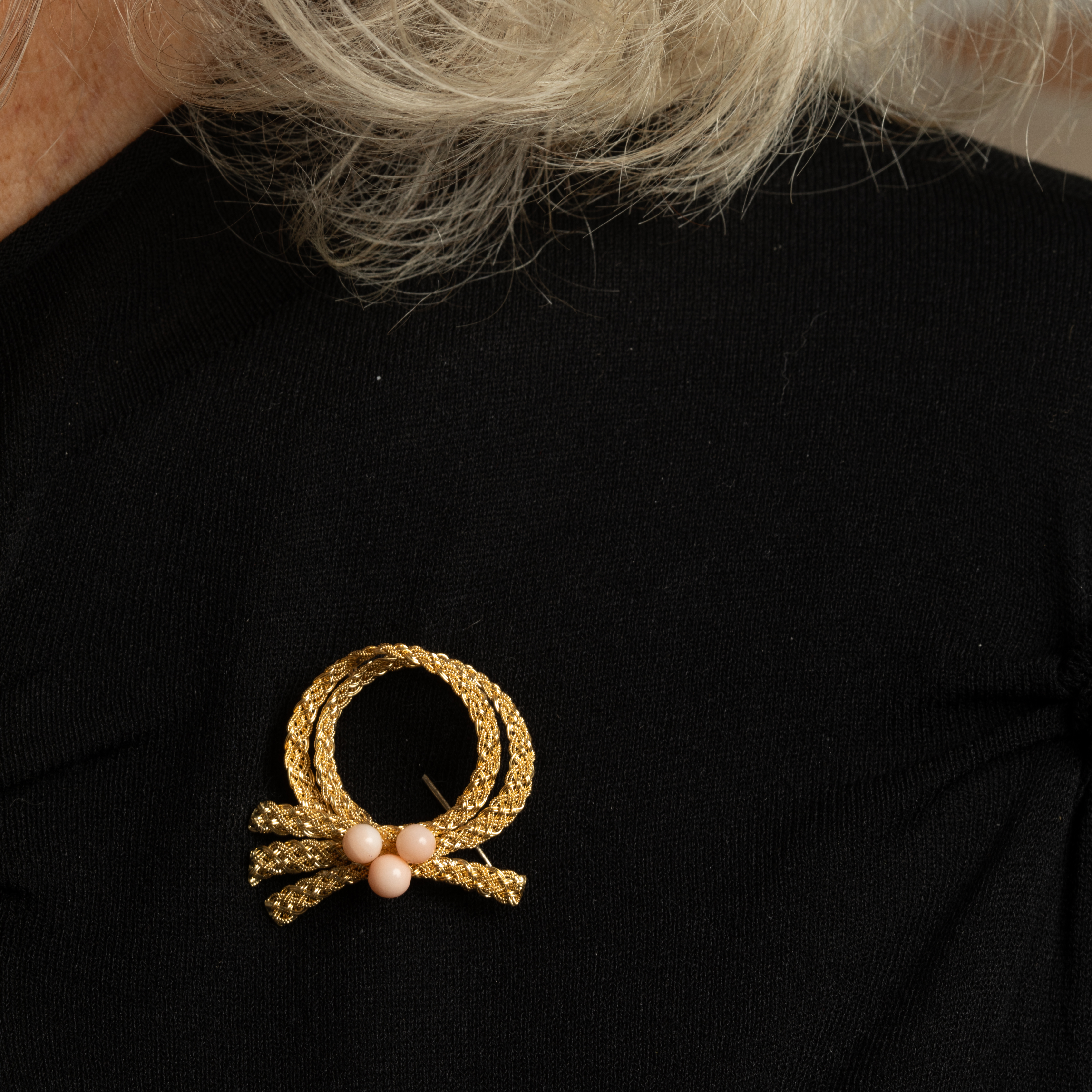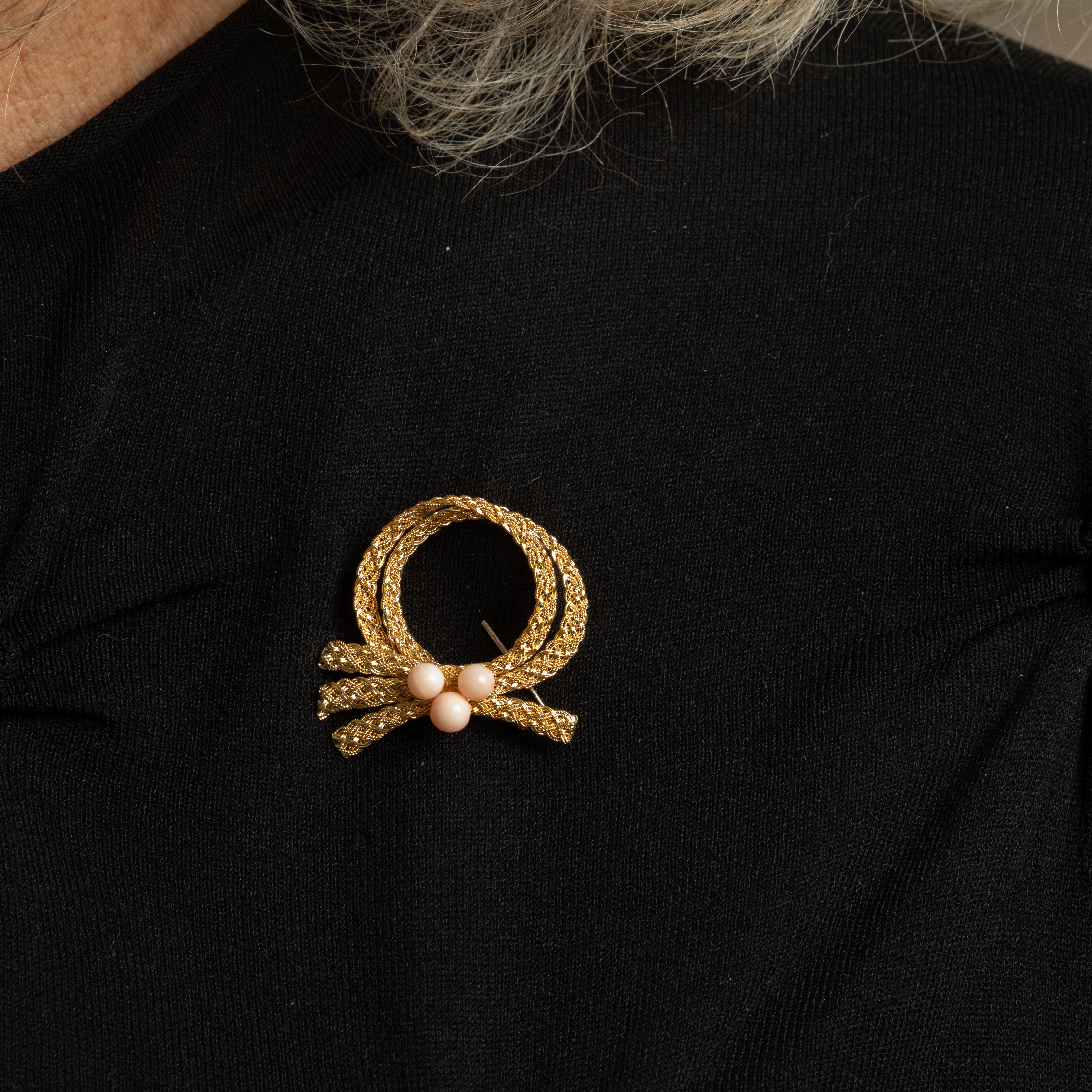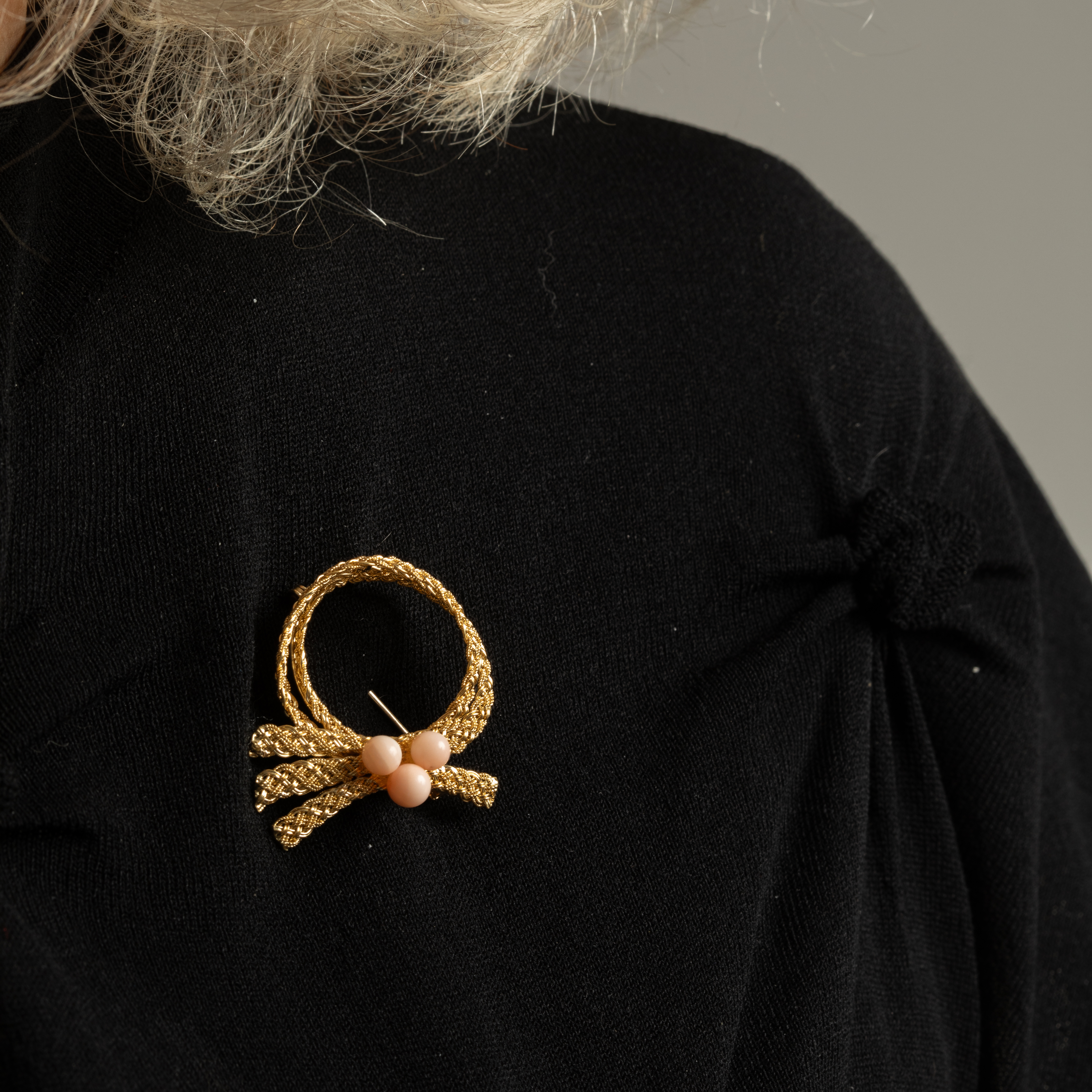 Imaginez une broche qui capture l'essence raffinée des années 1960, où l'or jaune 18k se tord en un ruban délicat et filigrané, orné de perles de corail naturel peau d'ange qui évoquent la chaleur du soleil méditerranéen.