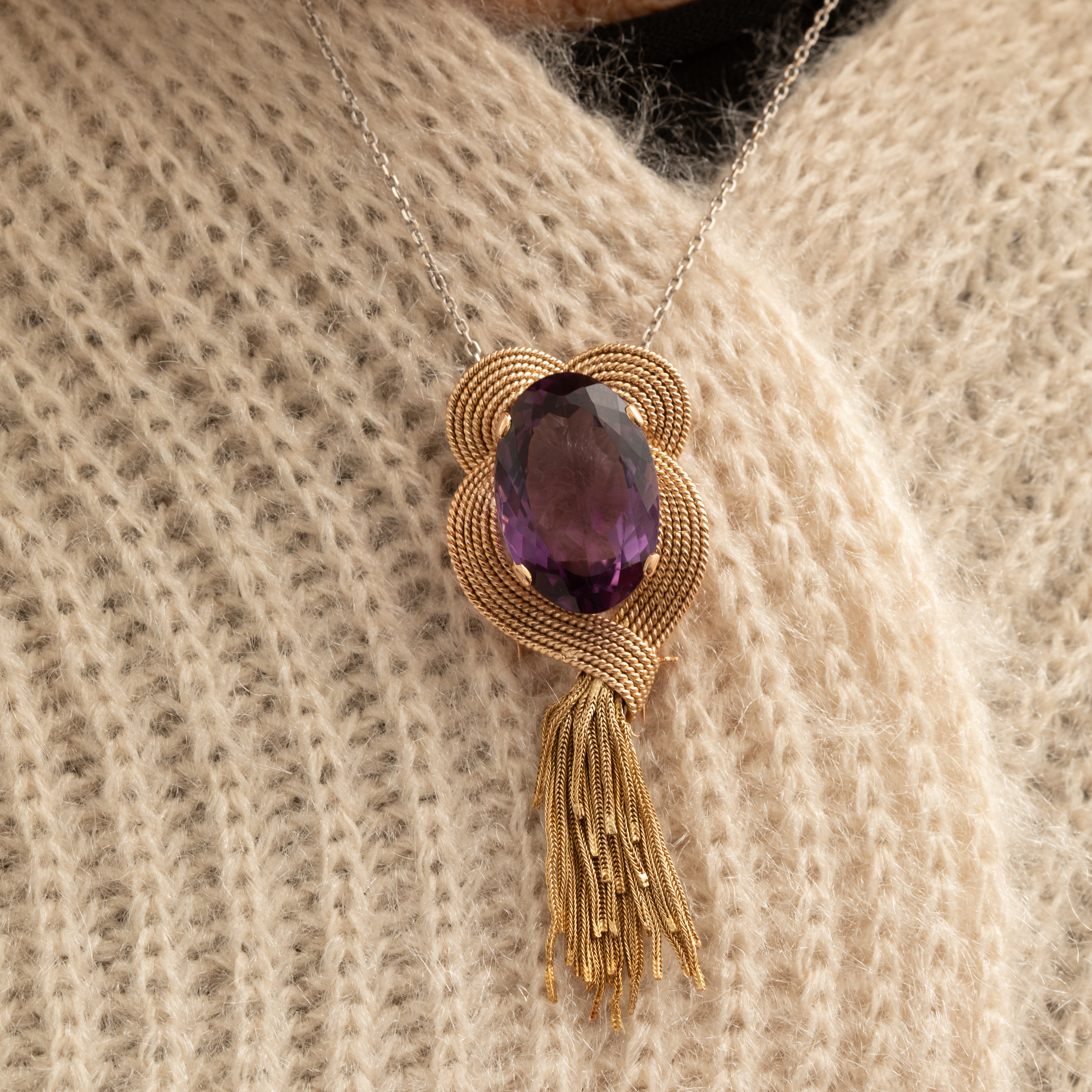 Au cœur de cette création artisanale trône une améthyste naturelle ovale d'environ 20 carats, dont la profondeur violette capte la lumière comme un joyau royal.