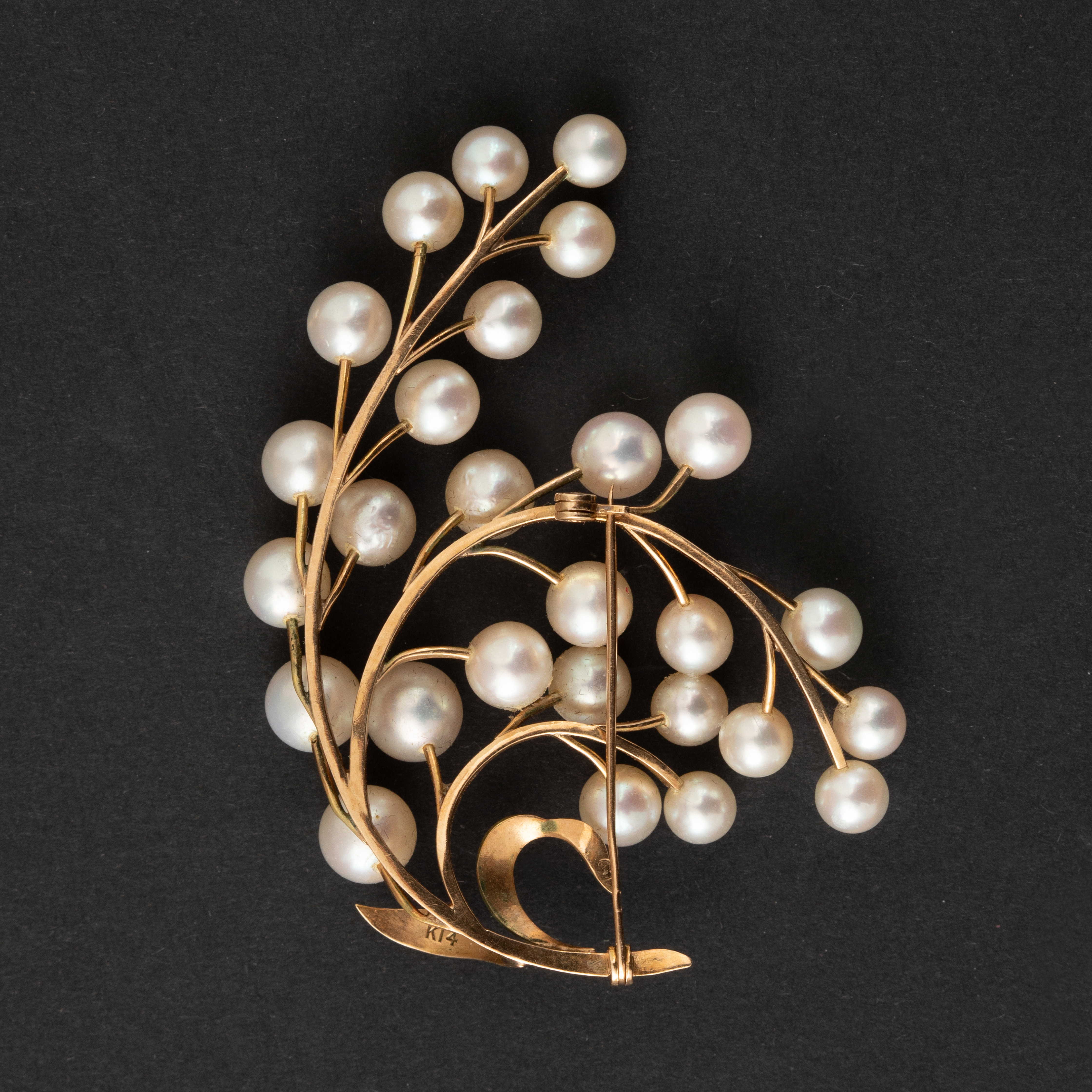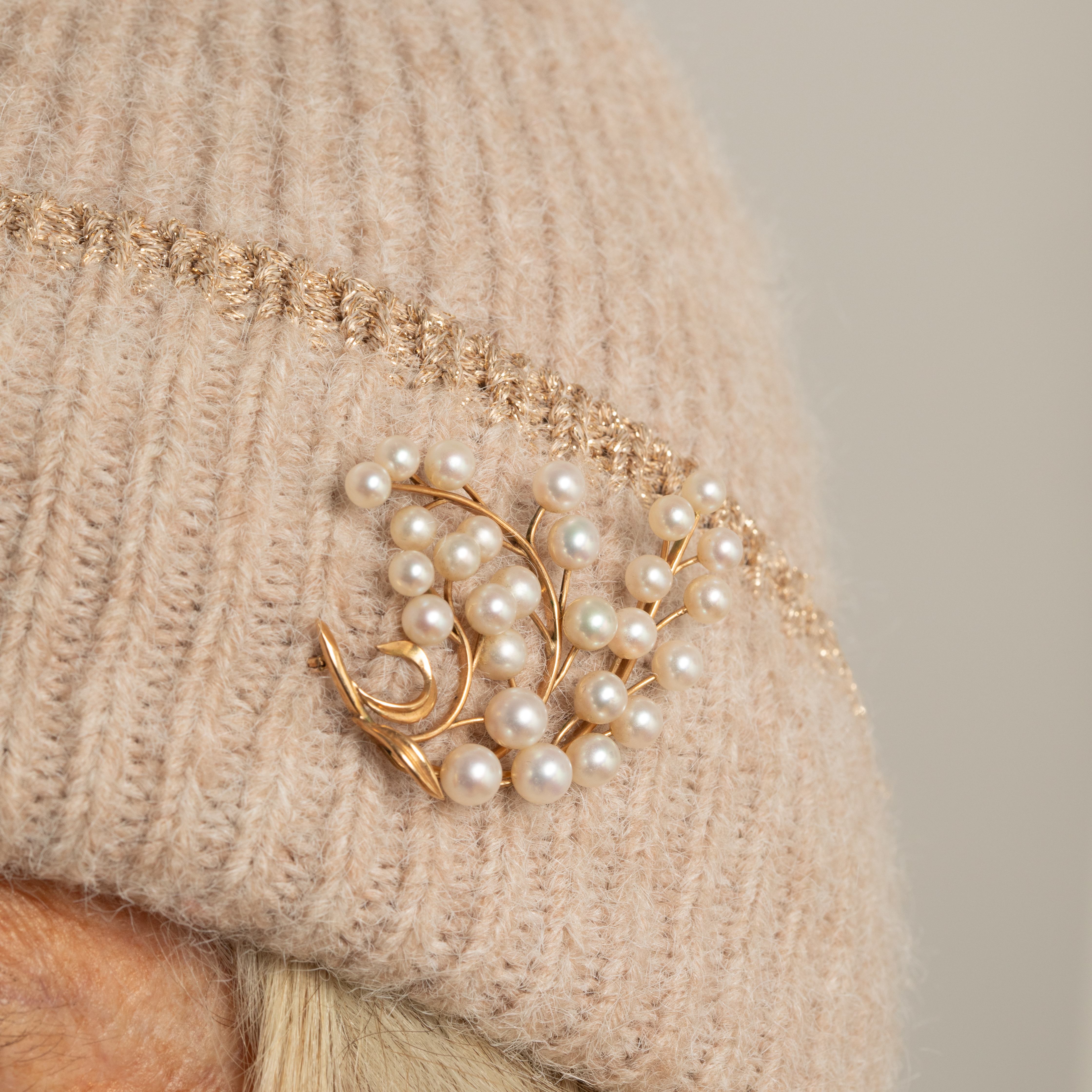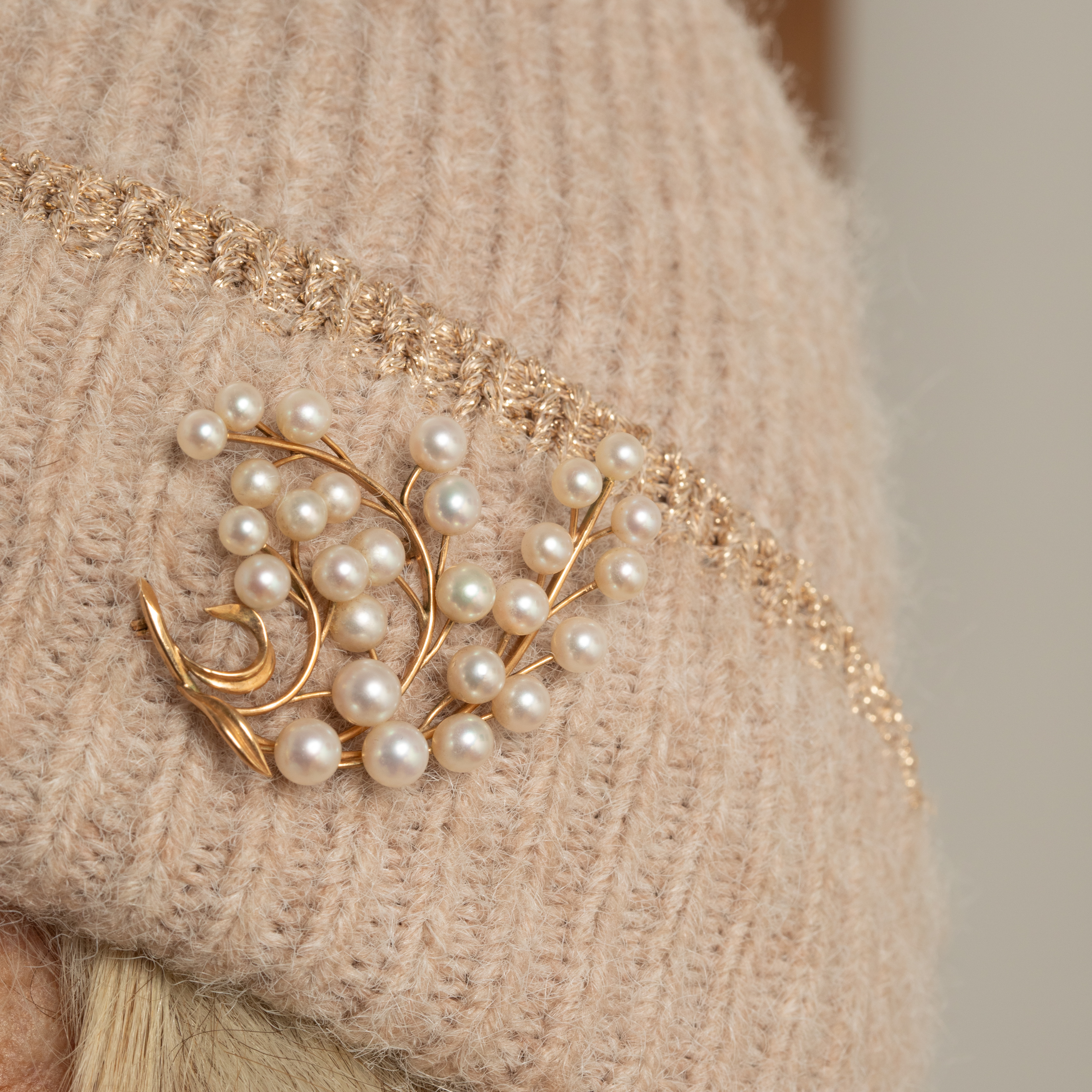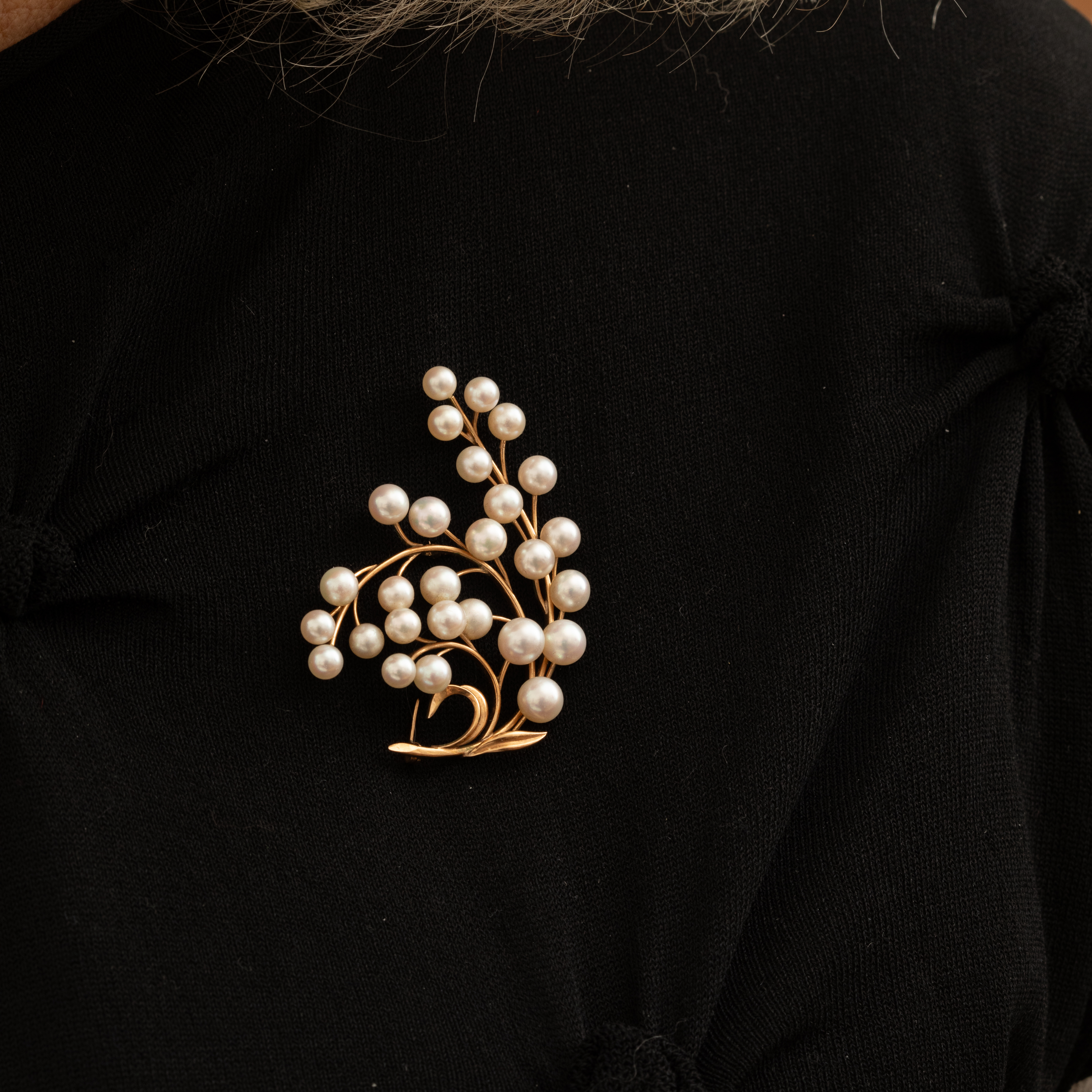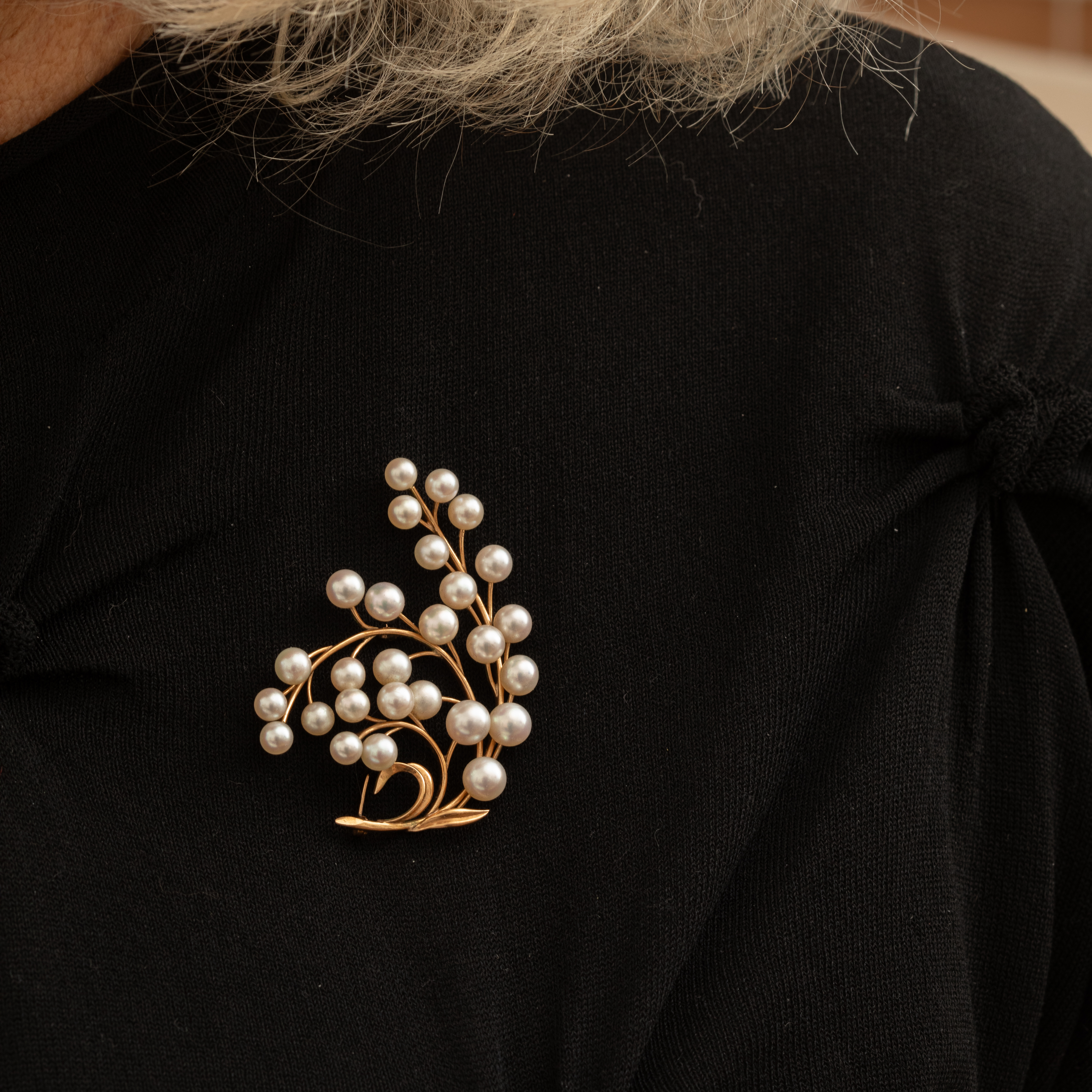 Cette broche vintage des années 40-50 évoque la grâce naturelle d'un jardin secret, où chaque perle de culture Akoya capture la lumière avec une douceur lumineuse.