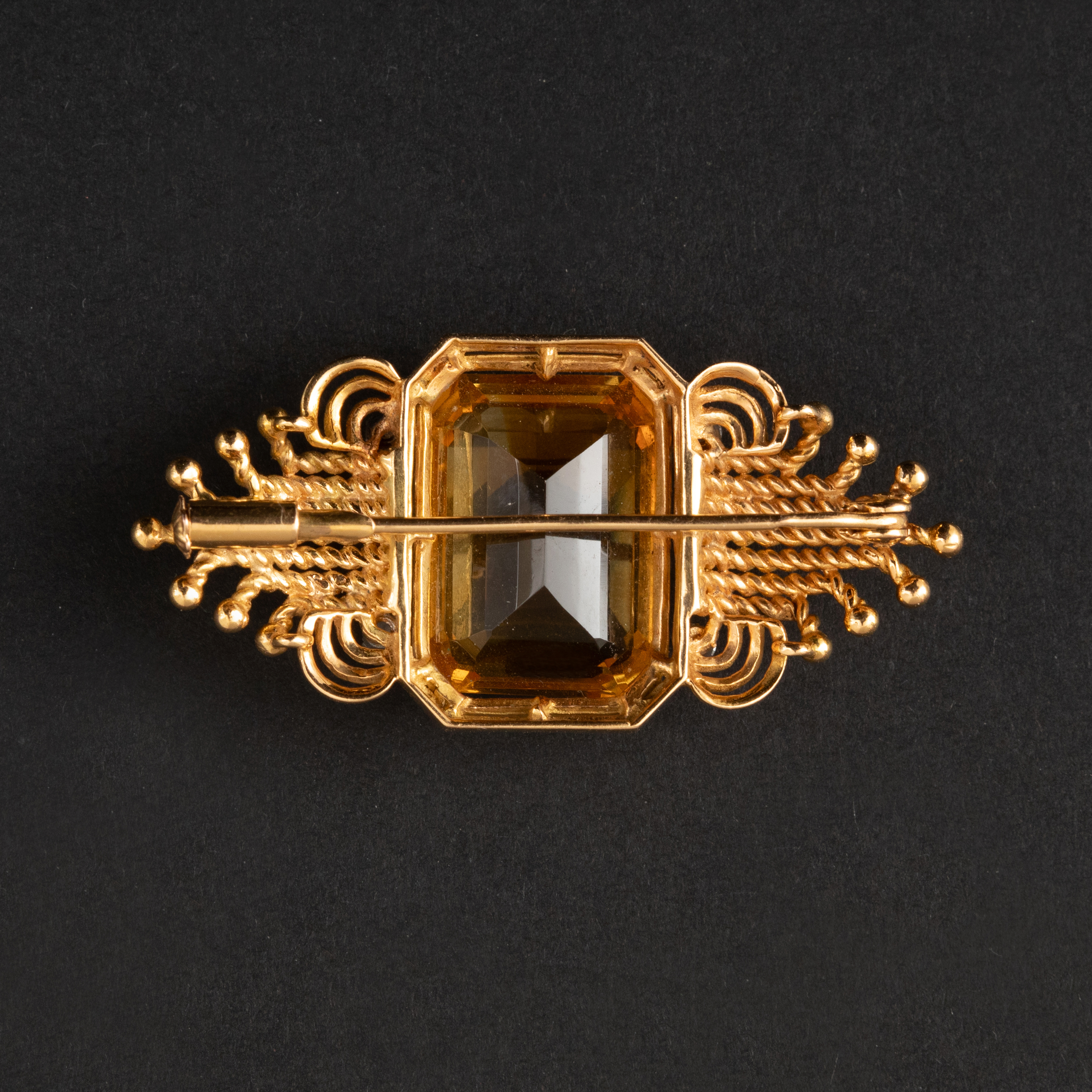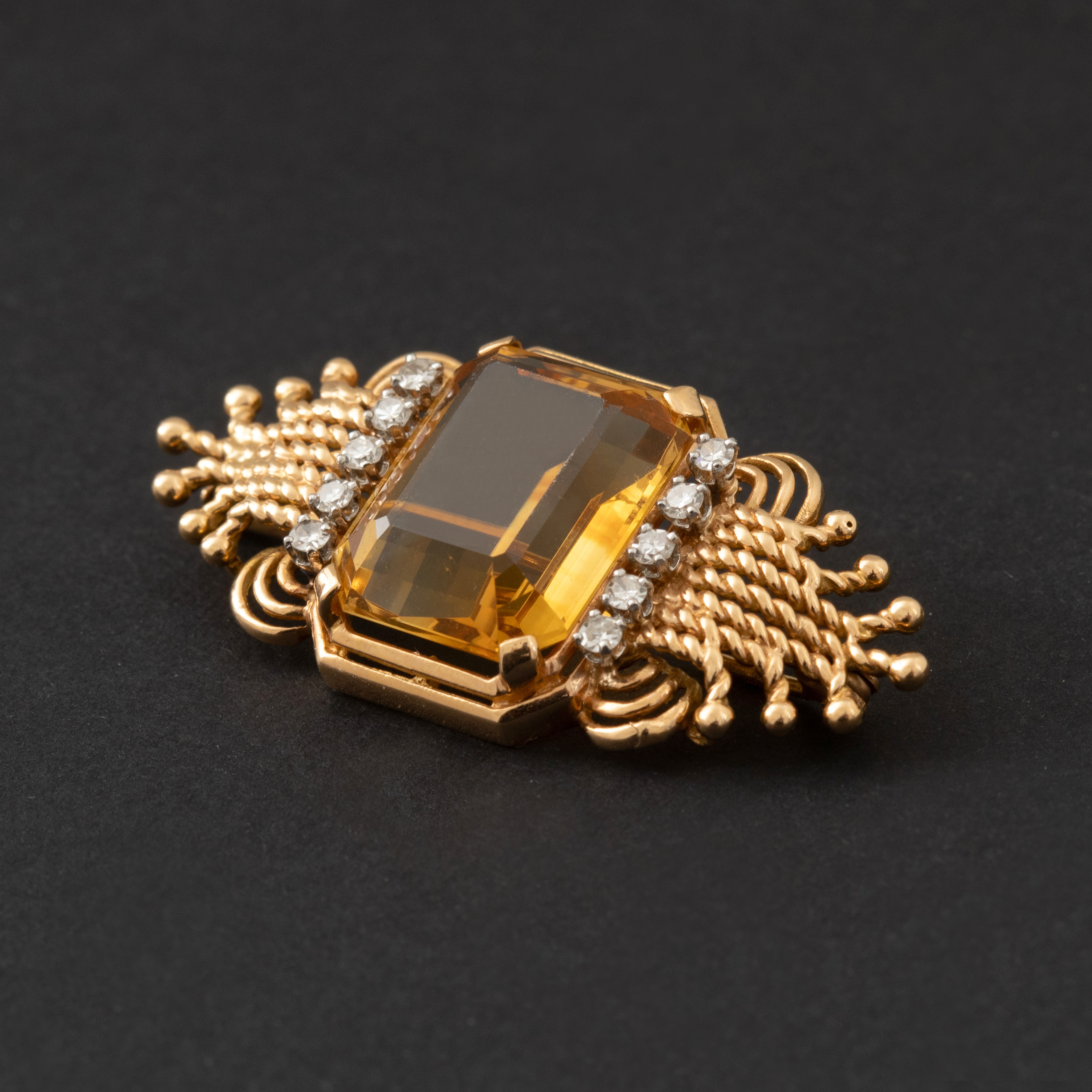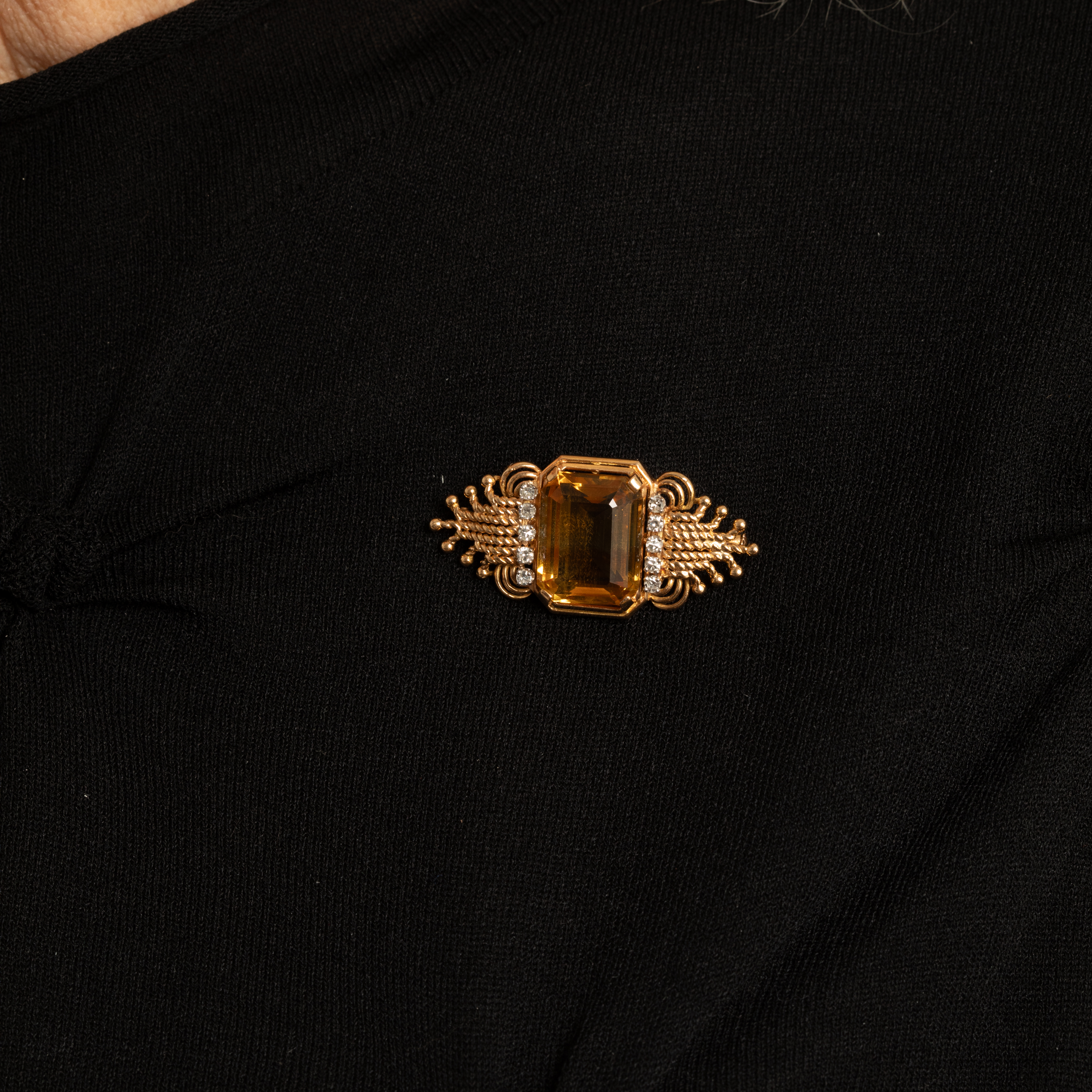 Plongez dans l'élégance intemporelle des années 40-50 avec cette broche citrine et diamants exceptionnelle.